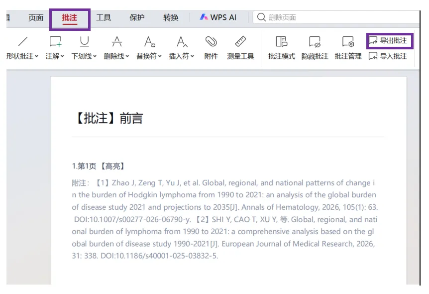 WPS批量导出批注方法 有没有人喜欢一边写论文,一边在批注里面插入参考文献? 最后导出全部的参考文献还再一个个的复制? 快来学习一个简单方法吧! 【1】另存一份文件,改为PDF格式,保存 【2】打开PDF文件,点击“批注”–导出批注, 如图,就全部整理好了!