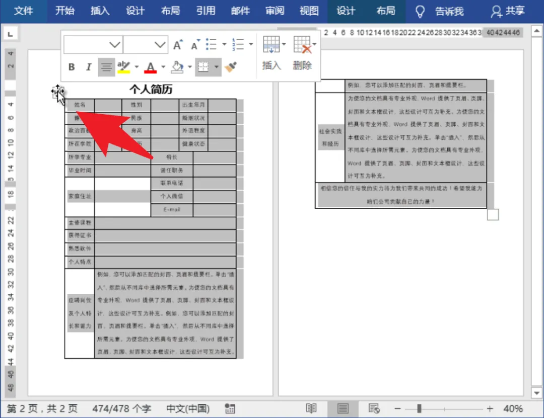 文档中若包含表格,表格的宽窄与行高常常是导致内容分页的“罪魁祸首”。要解决这一问题,先选中整个表格。