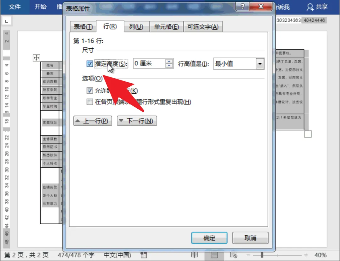 接着,切换到“行”选项卡,确保“指定高度”选项处于未勾选状态。这样,表格的行高就会根据内容自动变化,避免不必要的空间浪费。