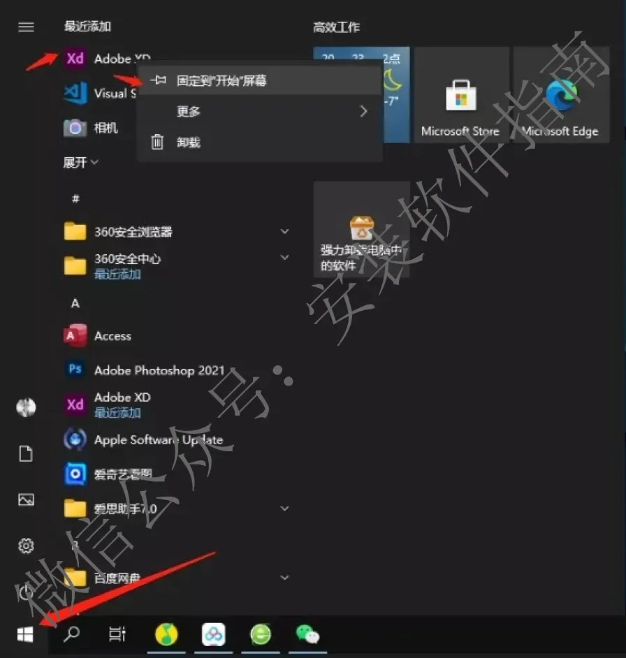 7.点击左下角的微软图标找到对应的软件固定到开始屏幕
