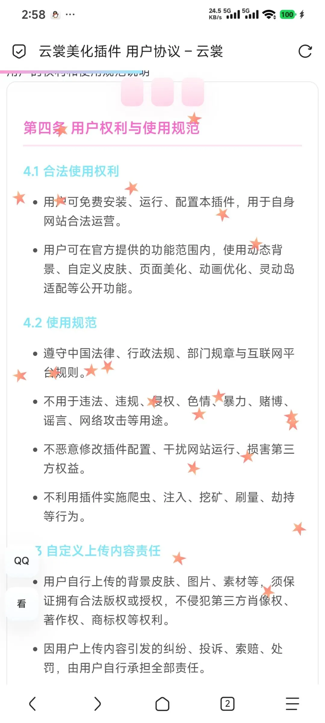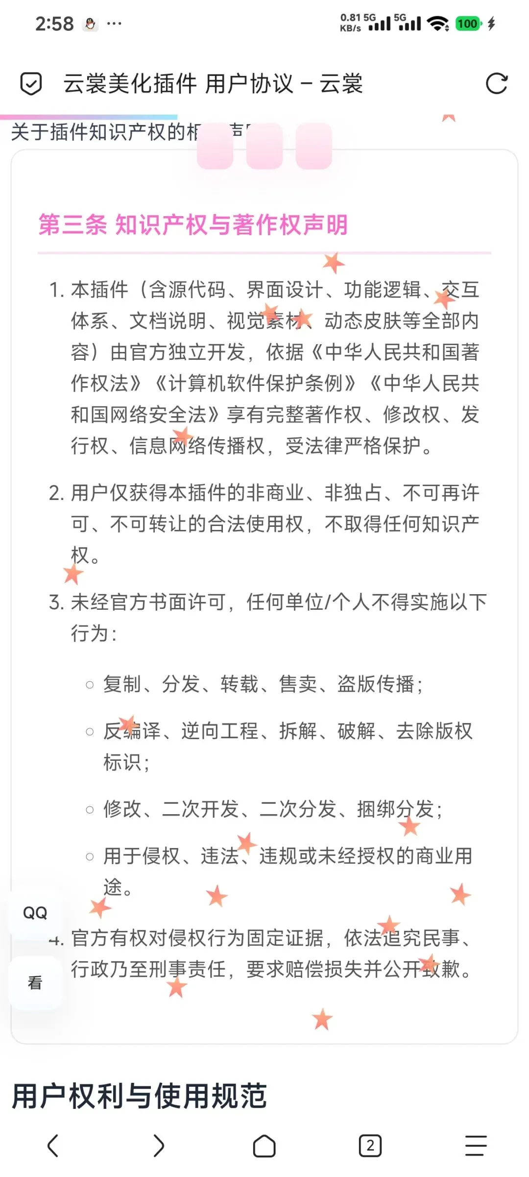 本协议是用户(以下简称”用户”或”您”)与云裳美化插件开发者(以下简称”官方””我方”)之间,关于使用云裳美化插件(以下简称”本插件”)所订立的权利义务约定。