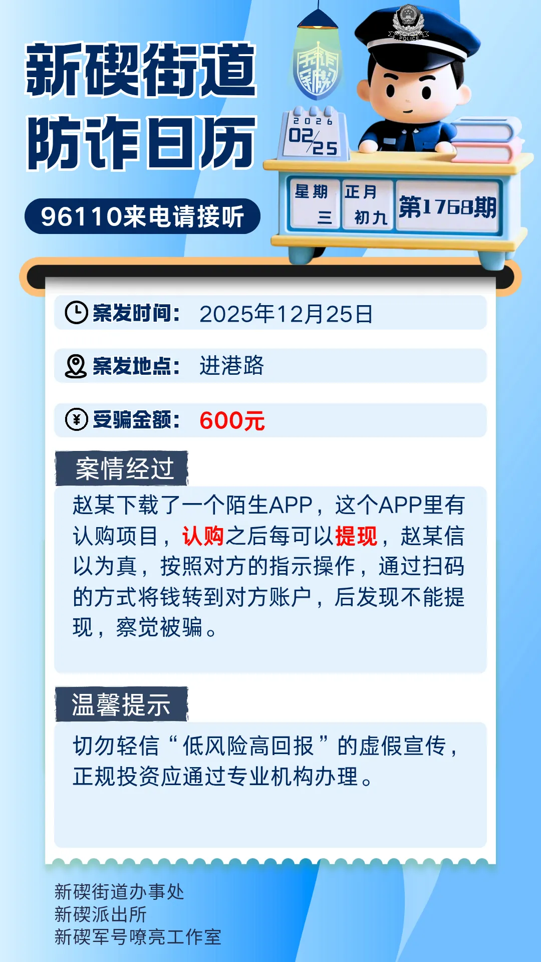 2025年12月25日,赵某在新碶街道进港路停车场在刷抖音时下载了一个APP,这个APP里有认购项目,每份是299元,认购之后每10天可以提现50元,赵某信以为真,按照对方的指示操作,通过扫码的方式将600元支付给对方,后发现不能提现,察觉被骗,来所报案,总损失价值600元。