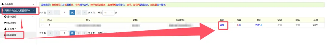 点击“高新技术企业发展情况报表” -数据管理-填报,开始填报。