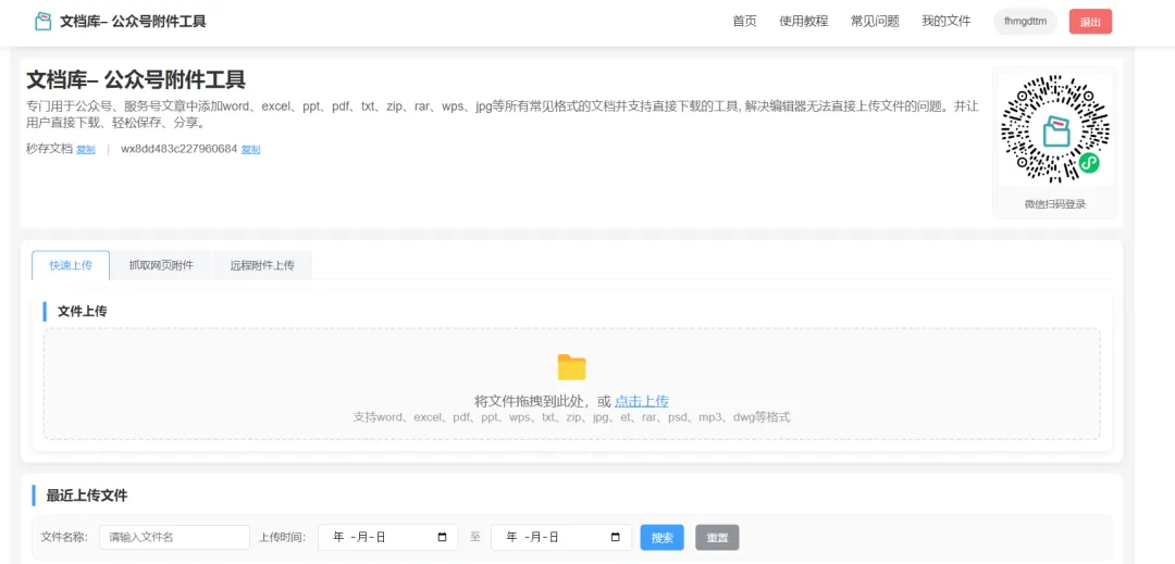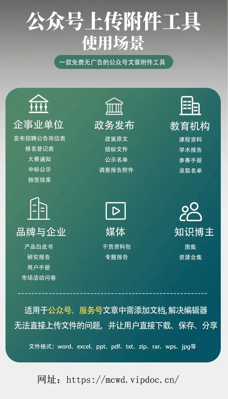 📢 使用场景:适用于公众号中插入各种文档(招聘岗位表、报名表、公示名单、报告、文件资料)等Word、Excel、PDF、PPT、ZIP等附件,用户可在线预览、下载分享!