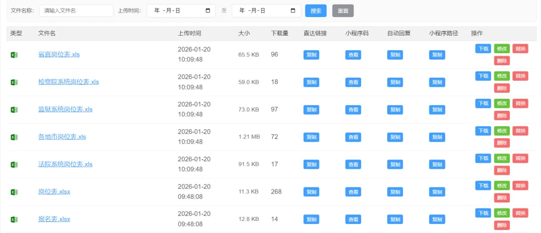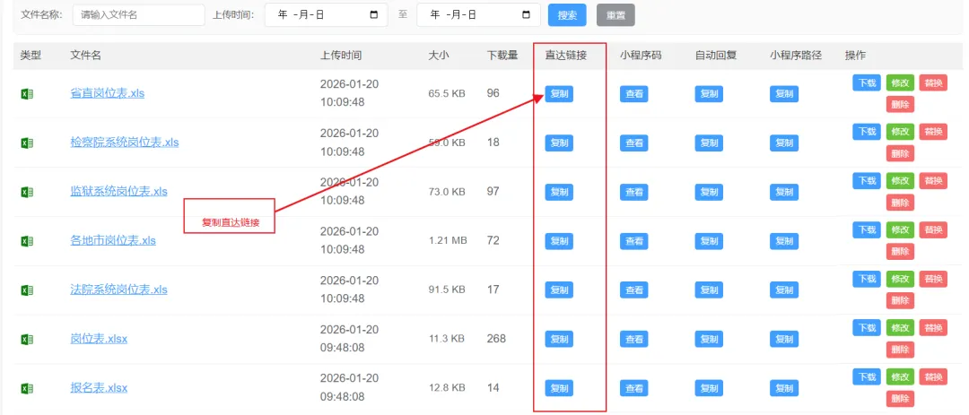 复制链接在文件管理页找到已上传的文件,点击“一键复制粘贴”或“直达链接”,复制生成的链接地址。