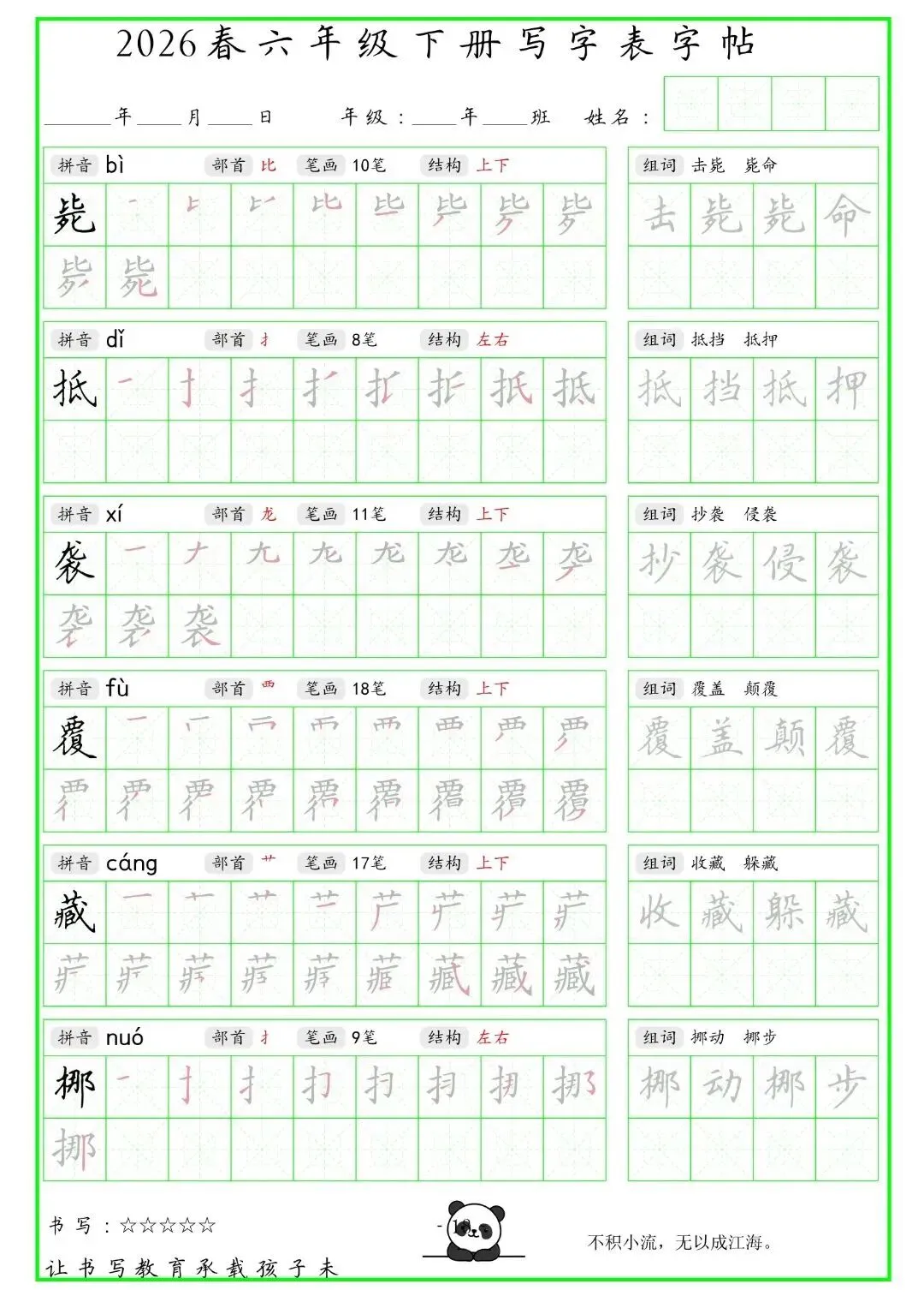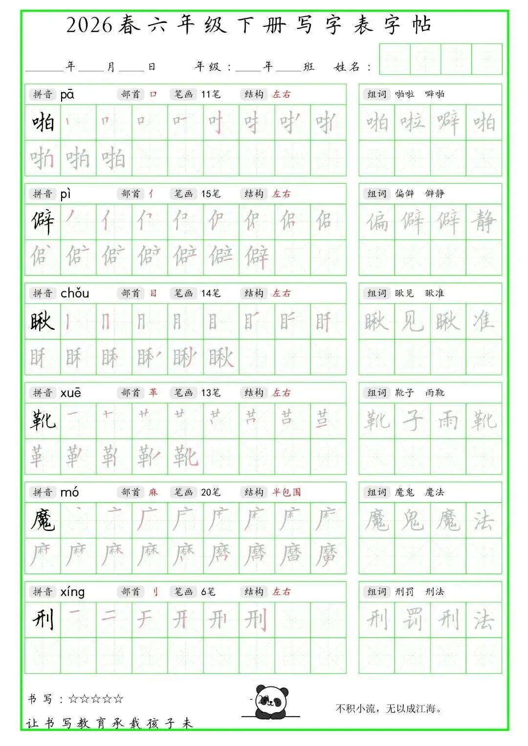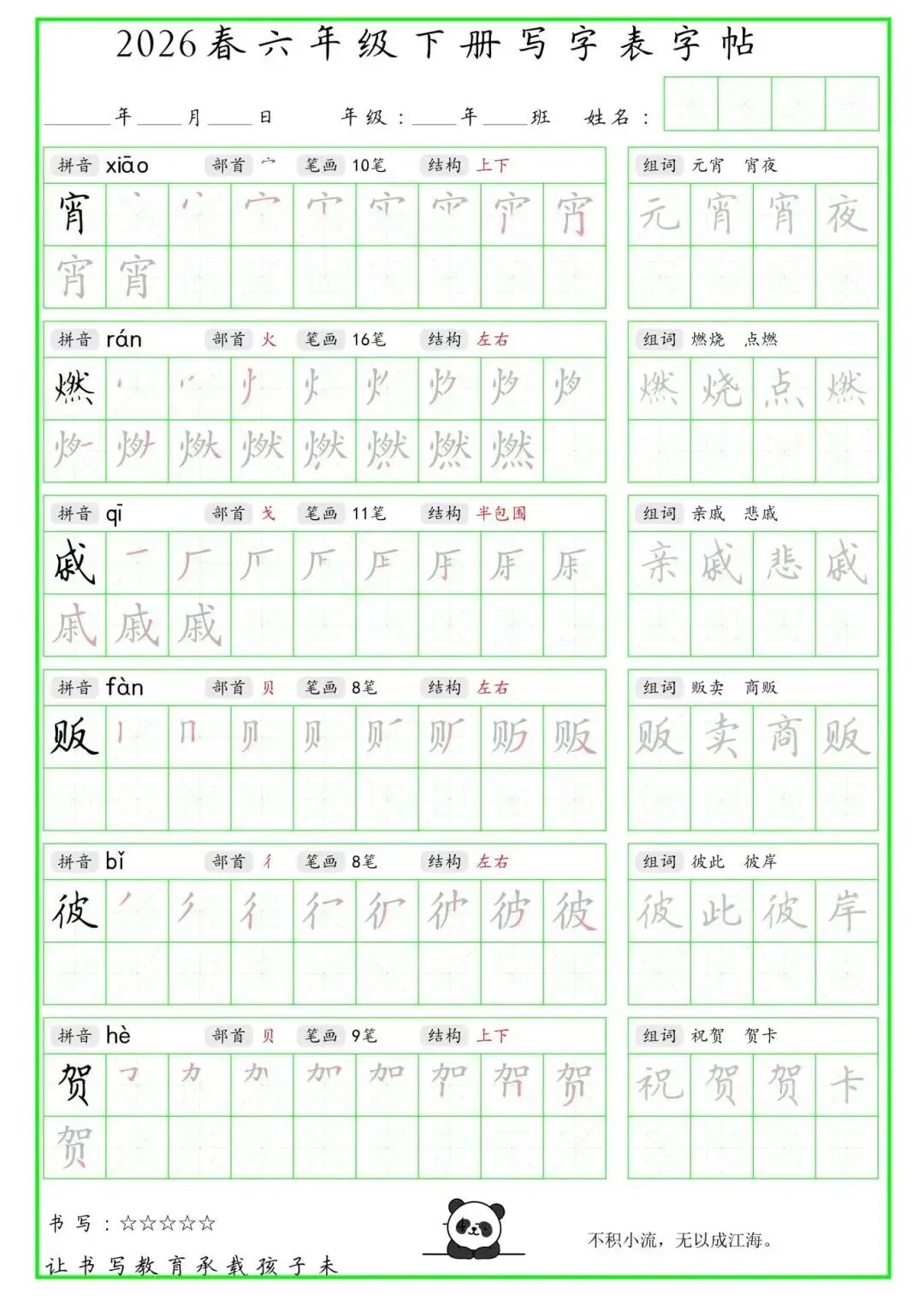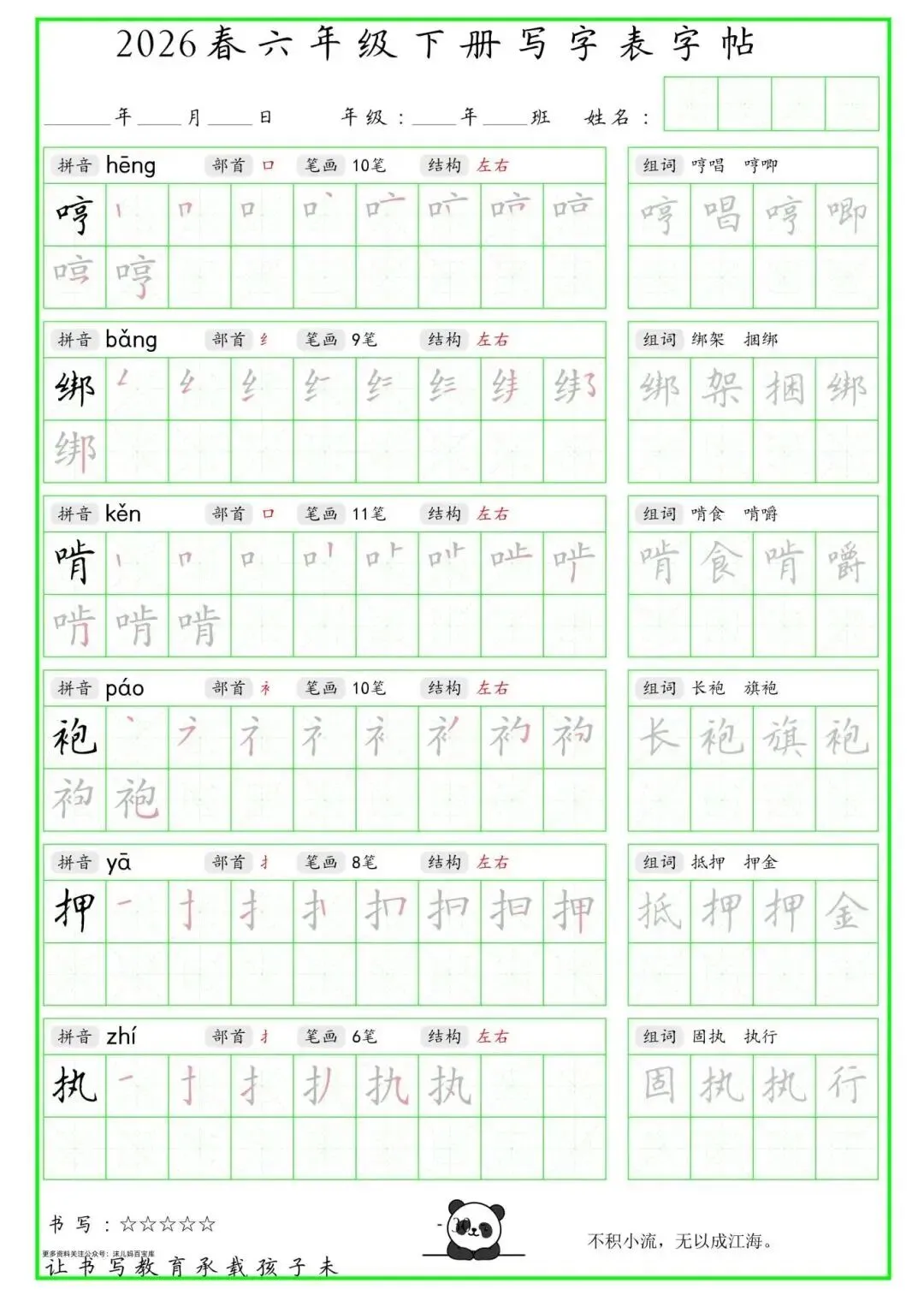 【免费下载】2026学年六年级下册人教部编版语文生字练字贴,同步课本含拼音笔顺 | PDF高清电子版可打印