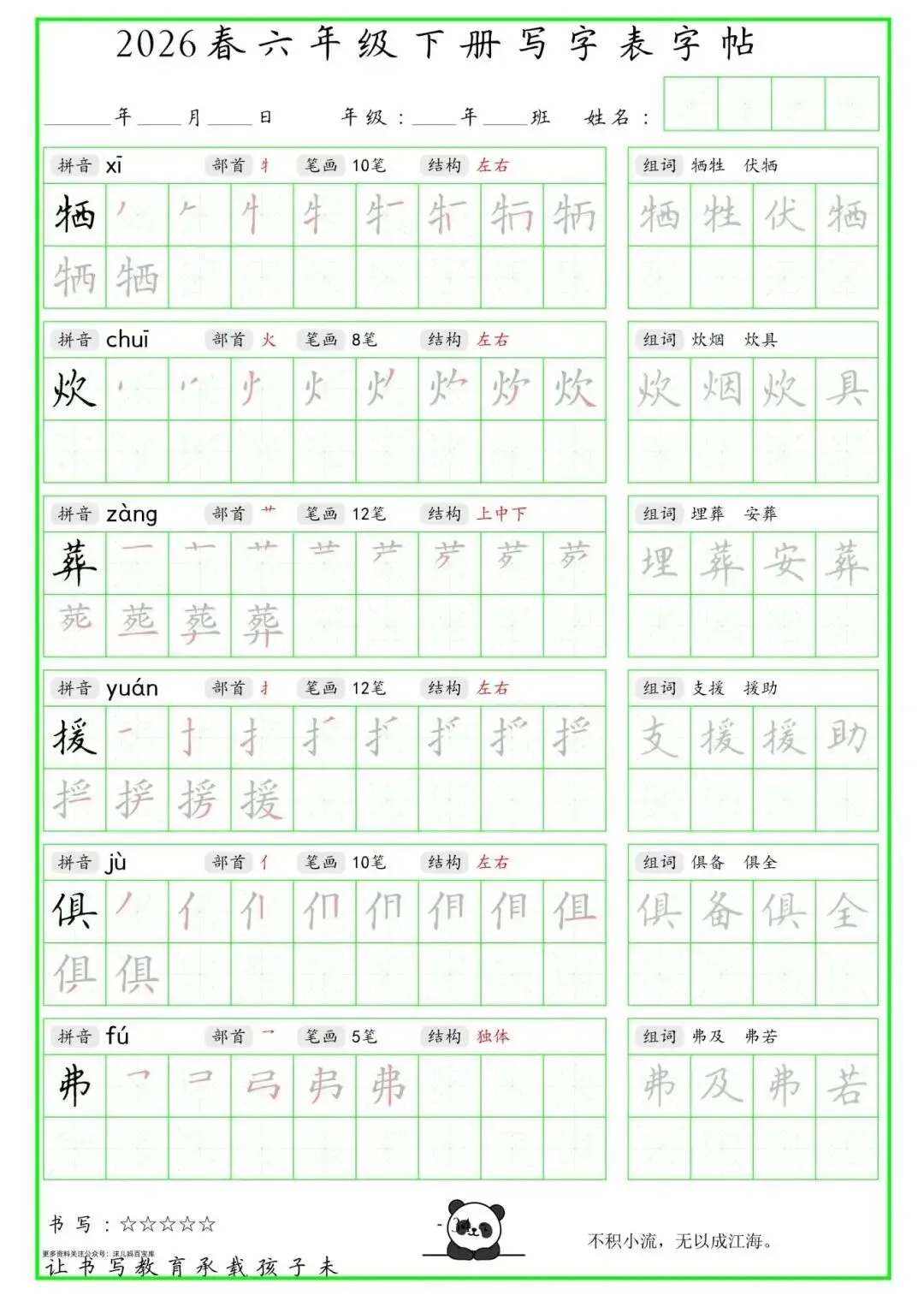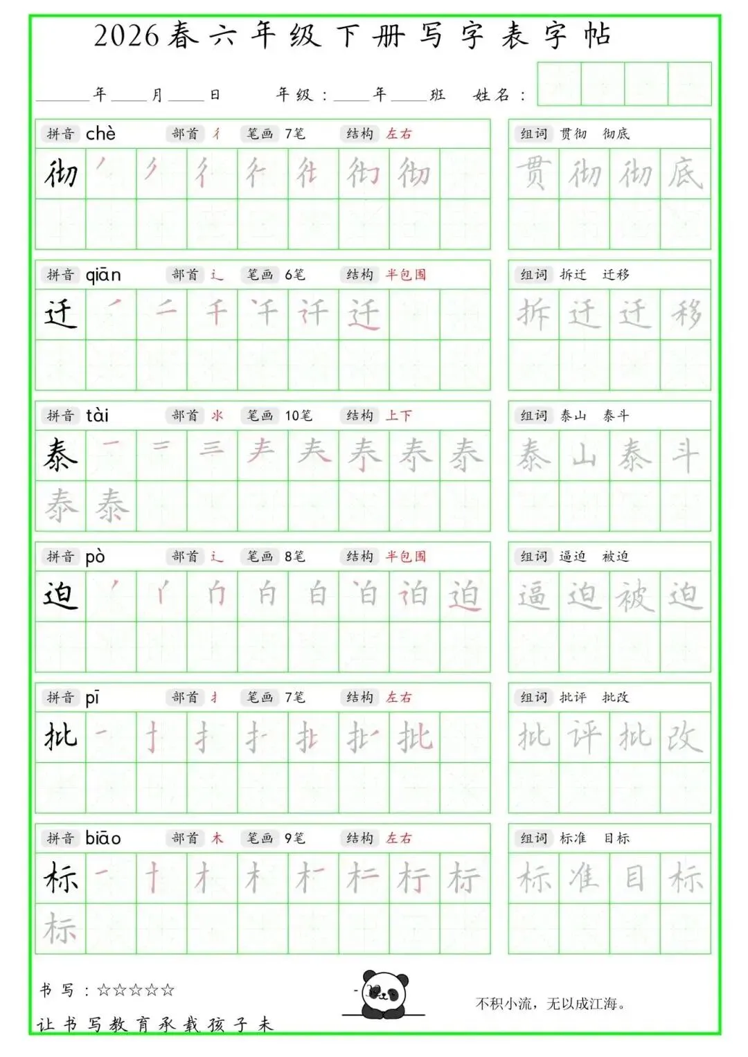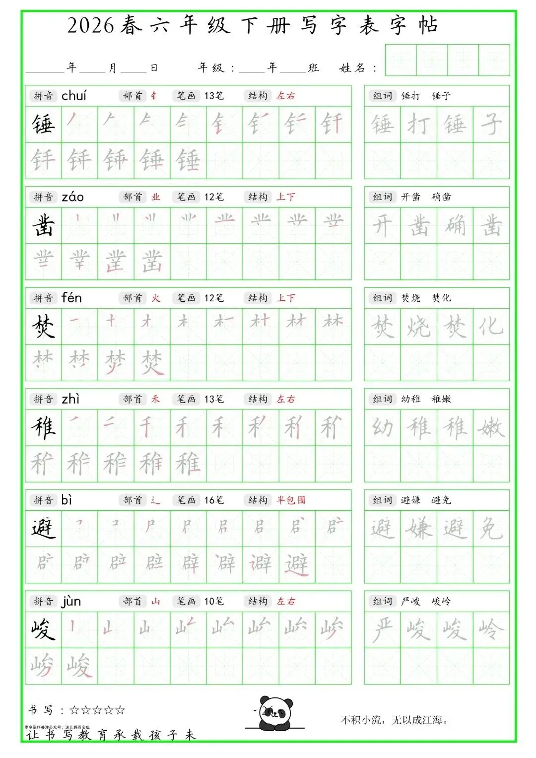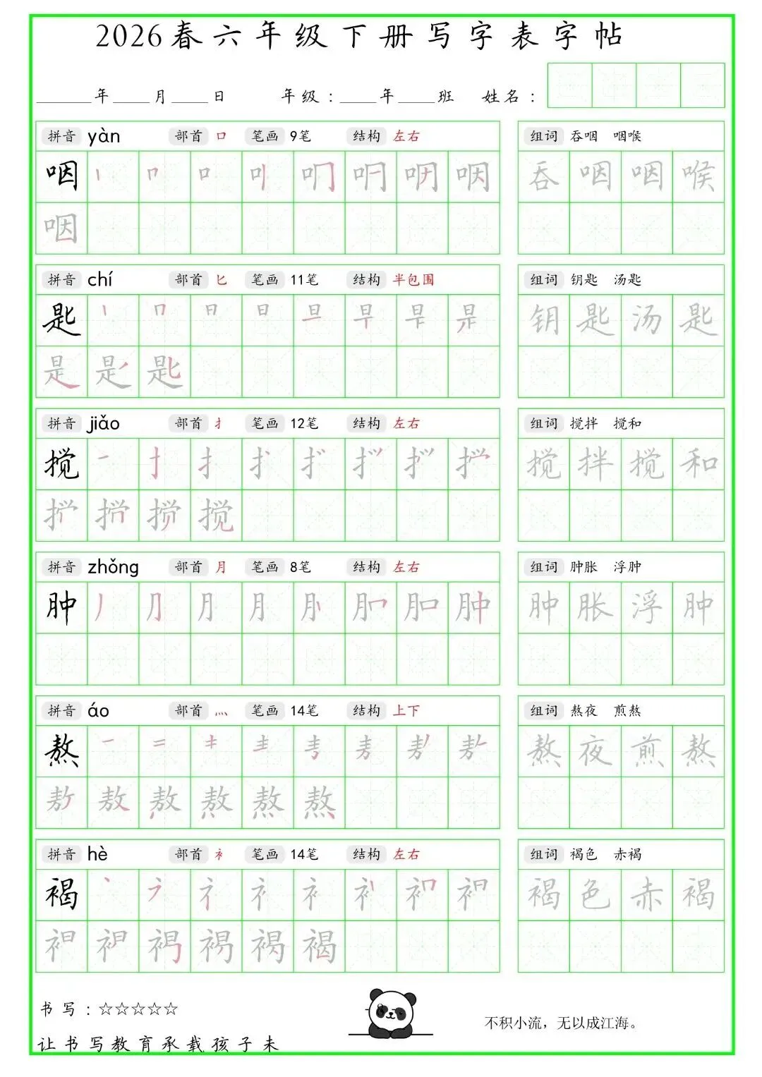 【免费下载】2026学年六年级下册人教部编版语文生字练字贴,同步课本含拼音笔顺 | PDF高清电子版可打印