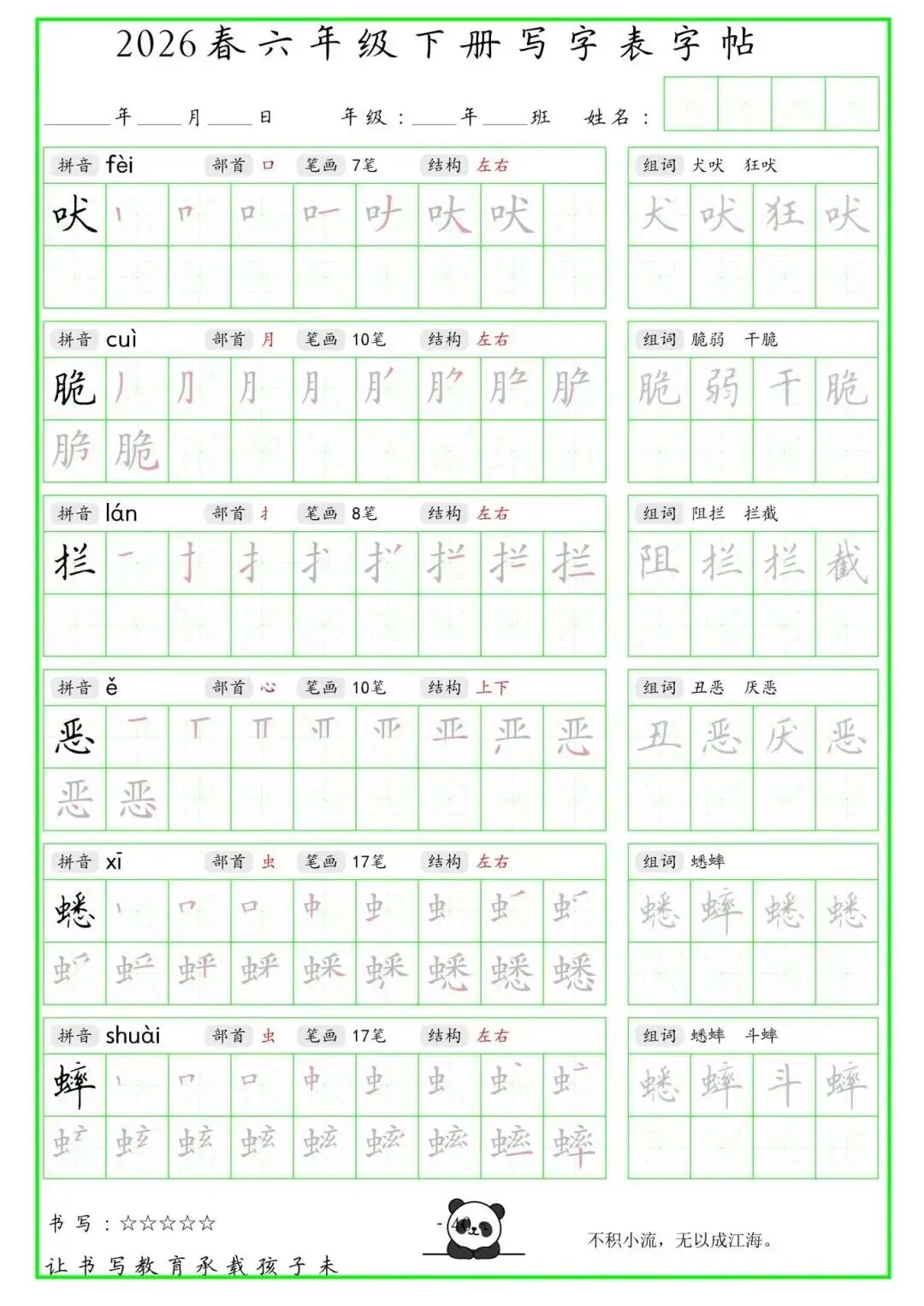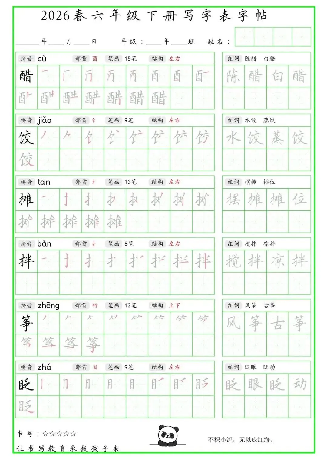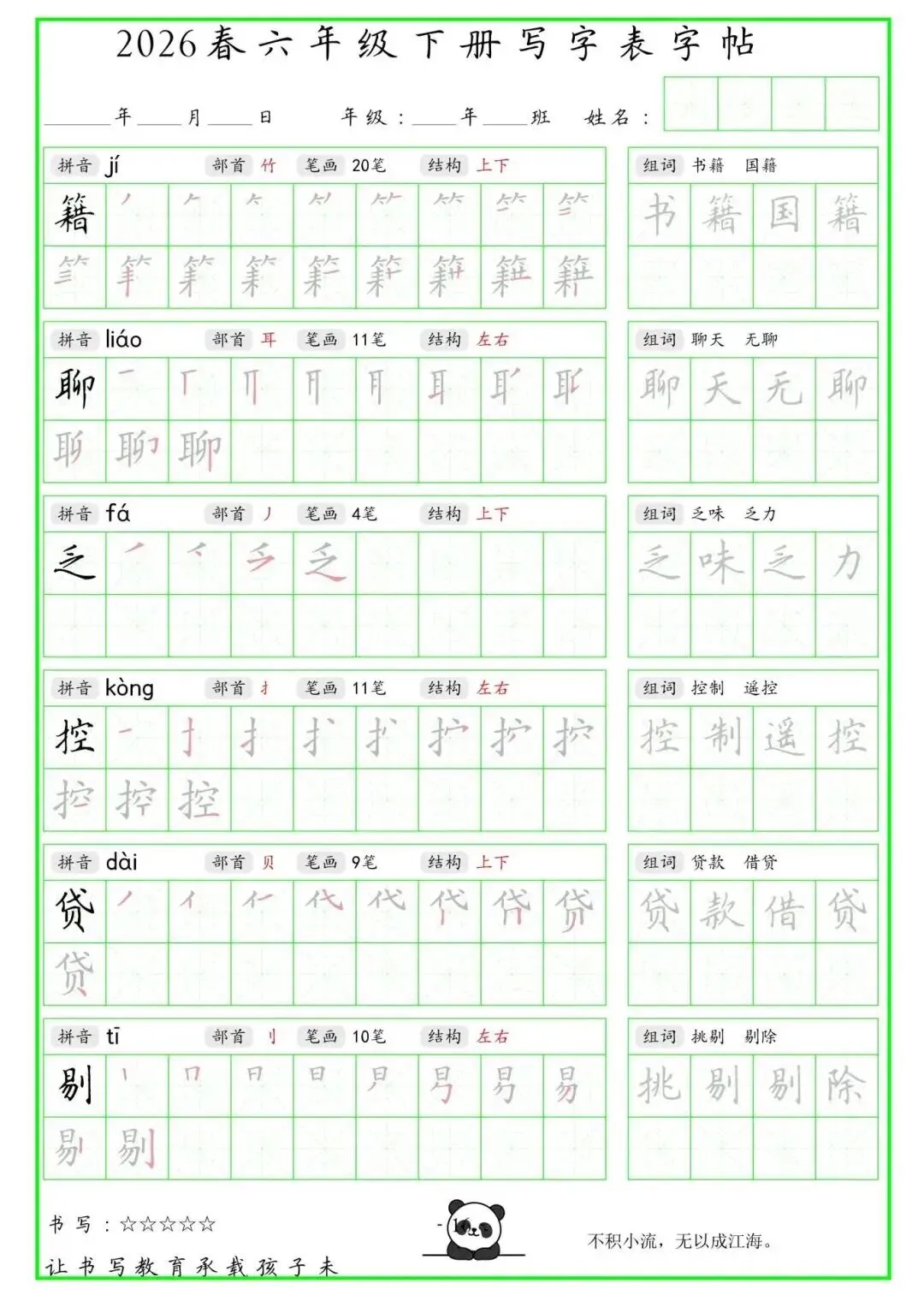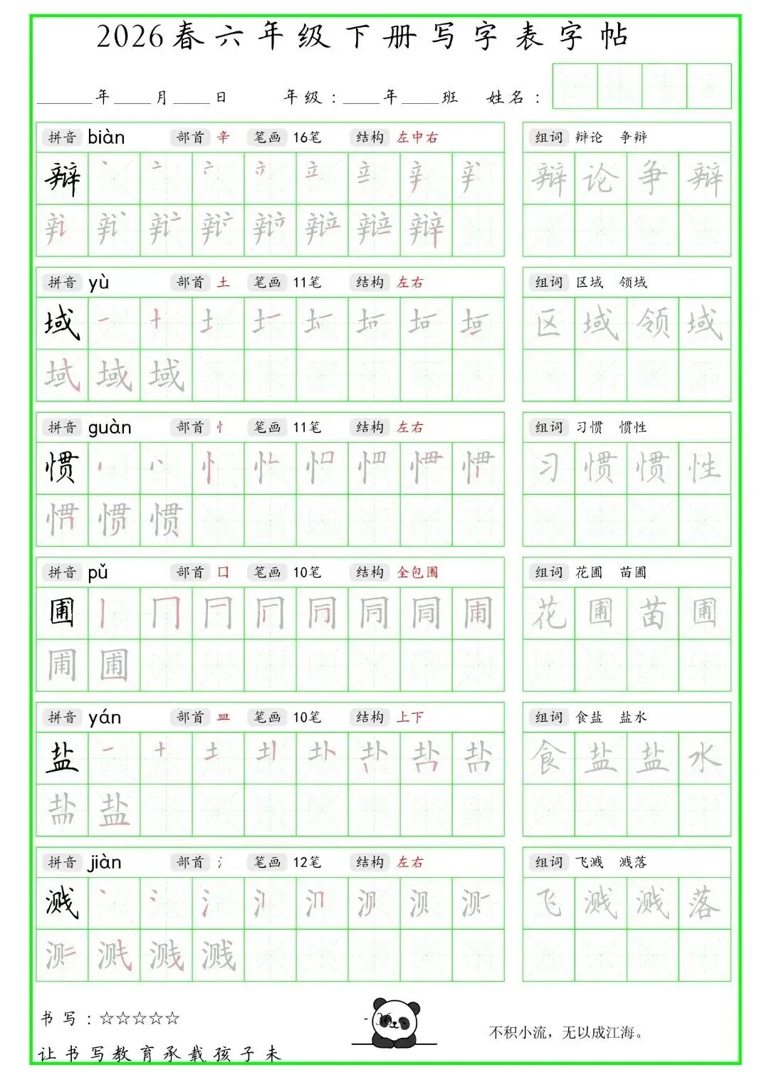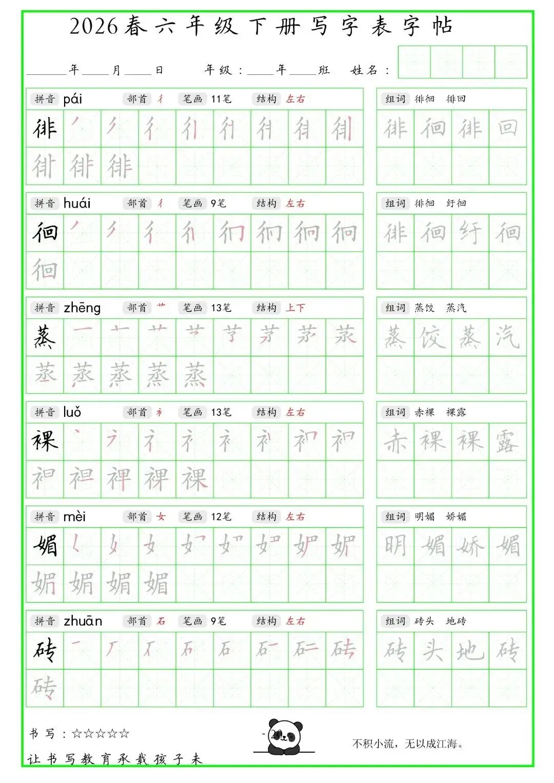 【免费下载】2026学年六年级下册人教部编版语文生字练字贴,同步课本含拼音笔顺 | PDF高清电子版可打印