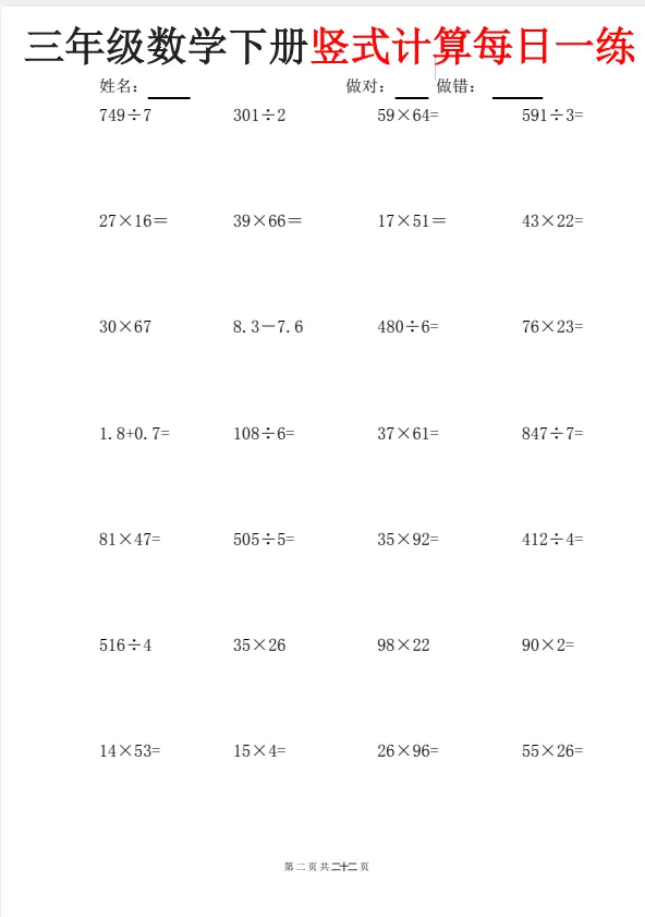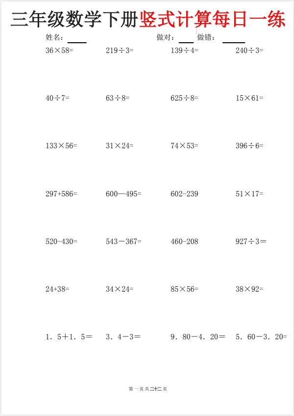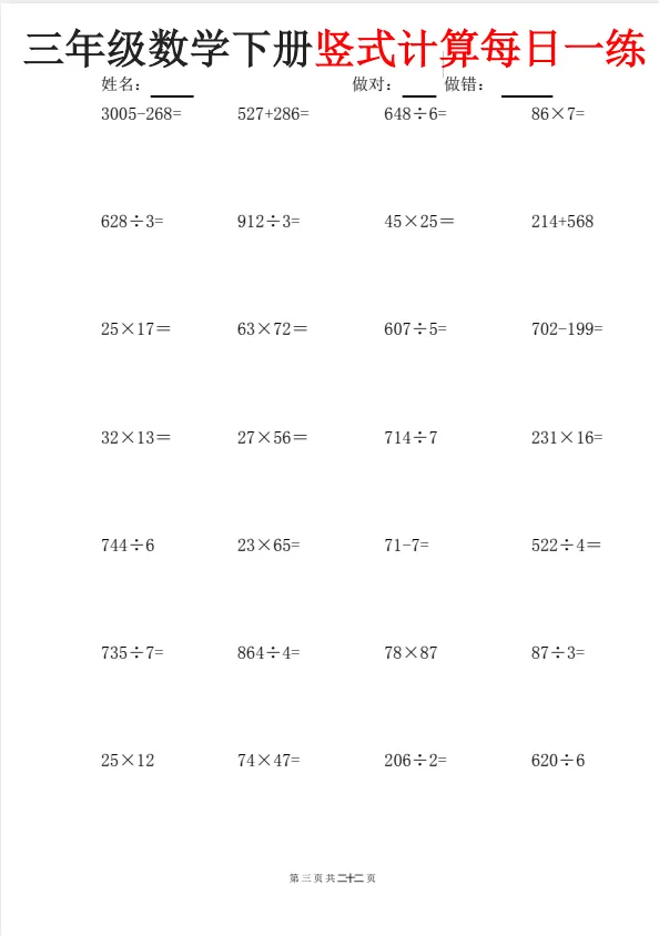 今天给大家准备好了!~三下数学竖式计算每日一练22页|可下载打印,建议分享到班级群/年级群,让家长打印出来,帮助孩子学习!