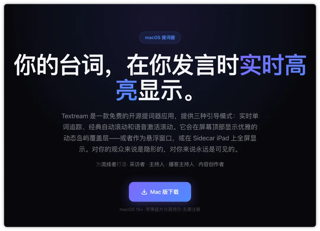 免费的 macOS 提词器 APP 水果软件管家 每个果粉都应该关注的一个公众号 关注水果软件管家 你可以获取少有人知的苹果软件和技巧 手机端的提词器APP有很多 有的是收费的,有的是免费的,有很多限免的 但是今天管家找到一款macOS端的 这款软件叫 Textream 她是一款免费、开源的 macOS 提词器APP 旨在帮助主播、面试官、演讲者和播客轻松地阅读台词 它提供三种模式:实时语音跟踪(高亮显示正在说的词) 经典自动滚动(恒定速度滚动)和 语音激活滚动(说话时滚动,静默时暂停) Textream 以时尚的动态岛风格悬浮窗显示在屏幕顶部 也可以作为可拖动的浮动窗口或在 Sidecar iPad 上全屏显示 说话时滚动,静默或静音时暂停,适合自然语速 尤其是对于现在有多设备联动功能的苹果设备 使用起来更加方便 通过本地网络浏览器连接 在任何设备(手机、平板电脑或另一台计算机)上查看提词器 软件下载 有需要这款应用的果粉们 关注管家的公众号【水果软件管家】 下载地址 https://textream.fka.dev/