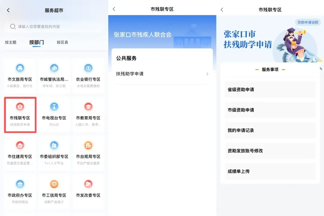 “幸福张家口”App【服务超市·按部门查找】今日带您走进一个传递温暖与关爱的部门——张家口市残疾人联合会专区。为减轻残疾学生及困难残疾人家庭子女的就学负担,市残联联合财政、教育等部门出台了一系列资助政策,并通过“幸福张家口”平台开通“扶残助学申请”服务,让符合条件的学子足不出户即可完成资助申请。