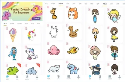 它完全免费,提供了丰富的绘画素材,包括:小动物、装扮、简单、进阶、表情、蔬果、交通工具、生活、花草,每个分类包括多个具体绘画素材。