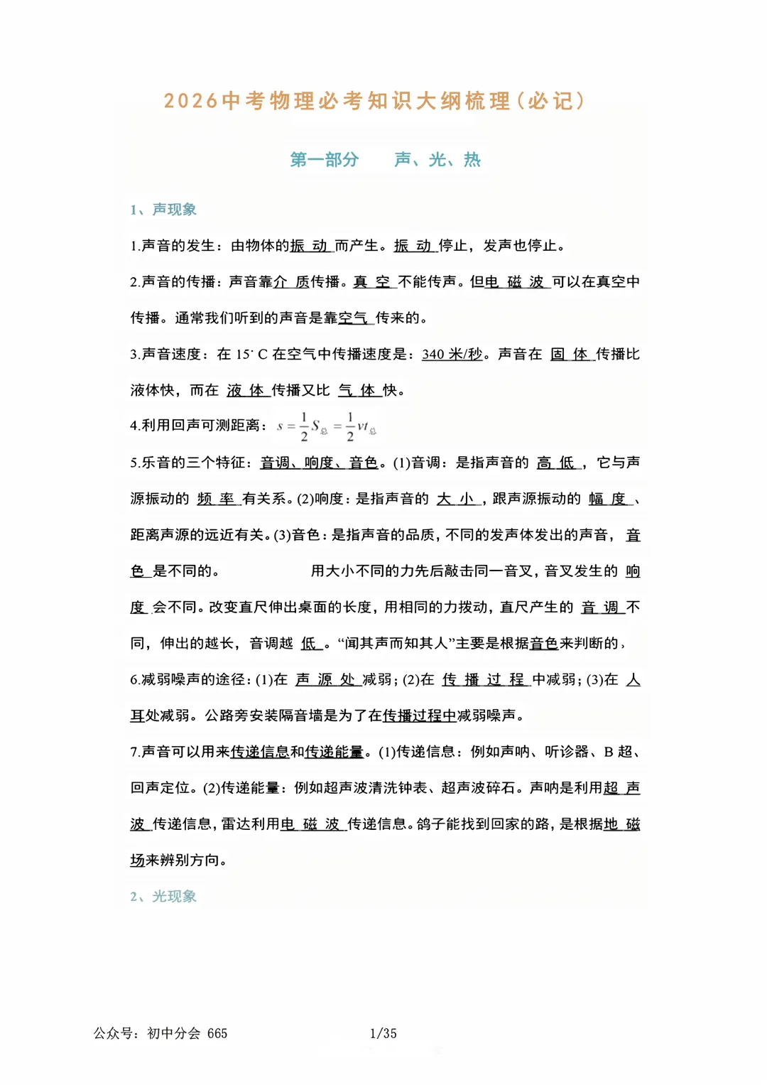 2026年中考物理必考知识点大纲梳理(可打印) 本期分享2026年中考物理必考知识点大纲梳理,欢迎师生转发背诵使用!(后台回复665获取本期资料,编号665) ——–END——– (后台回复665获取本期资源,编号665) 更多资源 2025.3河北各地市中考模考真题试卷及答案汇总(全科) 2026春晚考点全梳理,中高考生必看! 初中英语核心1600词汇分类速记表(共28天) 2026春新版八年级下册全册电子课本(可打印) 初中英语必背2182个单词汇总(含音标) 2023-2025中考数学【圆的综合】专项真题汇编(含解析) 初中物理18个重要实验及方法汇总 中考英语固定搭配短语汇总(共15页) 2025年河北省中考真题及答案(全科含听力) 2025.4.29石家庄市中考一模全科试题及答案(含听力) 2025.4石家庄市中考一模地生试题及答案 2026春新人教版八年级历史下册预习提纲(可打印) 2026春新人教版八年级历史下册预习提纲(可打印) 2025年河北省中考真题及答案(全科含听力) 2025年河北省中考地生真题及答案 2024年河北省各地中考一模试卷汇总 2024年河北省中考真题试卷及答案(全科含听力) 2024年河北省中考真题地生试卷及答案(无水印可打印) 2020-2024年河北省中考五年真题汇总(全科含听力)