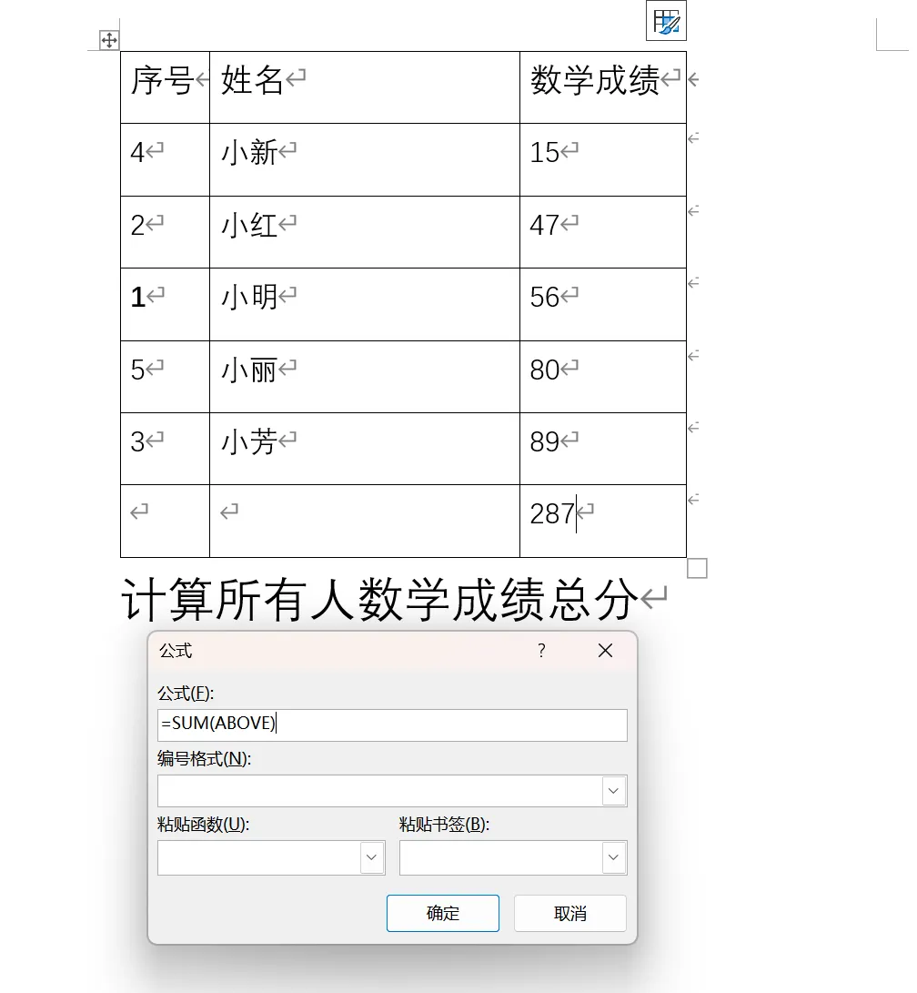 输入公式:在弹出的公式对话框中,Word会自动根据光标所在位置给出一些建议的公式,如“=SUM(ABOVE)”表示计算上方单元格的和,可直接点击这些建议,也可手动输入公式。