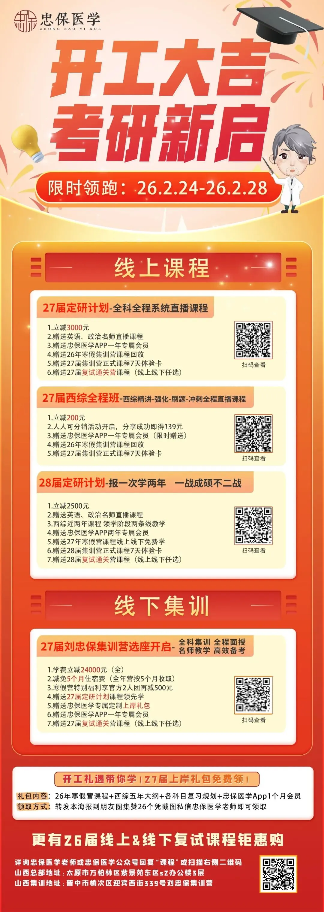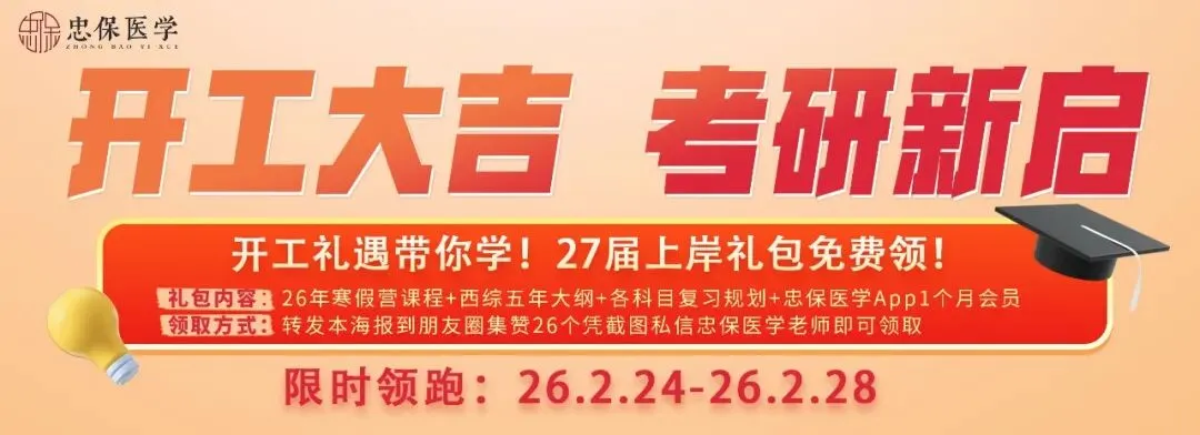 0元领!考研课程及APP会员限时放送! 27届上岸礼包 免费领!!! 包含↓ 26年寒假营课程 西综五年大纲 各科目复习规划 忠保医学App1个月会员 转发海报集赞即可领取 详情见下图👇 开工大吉 · 考研新启 限时优惠:2026.2.24-2026.2.28 27届定研计划 全科全程系统直播课程 1.立减3000元 2.赠送英语、政治名师直播课程 3.赠送忠保医学APP一年专属会员 4.赠送26年寒假集训营课程回放 5.赠送27届集训营正式课程7天体验卡 6.赠送27届复试通关营课程(线上线下任选) 课程详情戳👉【27届西综定研计划】 27届西综全程班 西综精讲-强化-刷题-冲刺全程直播课程 1.立减200元 2.人人可分销活动开启,分享成功即得139元 3.赠送忠保医学APP一年专属会员(限时赠送) 4.赠送26年寒假集训营课程回放 5.赠送27届集训营正式课程7天体验卡 课程详情戳👉【27届西综全程班】 28届定研计划 报一次学两年 一战成硕不二战 1.立减2500元 2.赠送英语、政治名师直播课程 3.西综近两年课程 领学阶段两条线教学 4.赠送忠保医学APP两年专属会员 5.赠送27年寒假营课程线上线下免费学 6.赠送28届集训营正式课程7天体验卡 7.赠送28届复试通关营课程(线上线下任选) 课程详情戳👉【28届定研计划】 27届刘忠保集训营选座开启 全科集训 全程面授 名师教学 高效备考 1.学费立减24000元(全) 2.减免5个月住宿费(全年营按5个月收取) 3.寒假营特别福利享官方2人团再减500元 4.赠送27届定研计划课程领先学 5.赠送忠保医学专属定制上岸礼包 6.赠送忠保医学APP一年专属会员 7.赠送27届复试通关营课程(线上线下任选) 课程详情戳👉【刘忠保老师面授集训营】 开工礼遇带你学 27&28考研限时领跑 更有26届线上&线下复试课程钜惠 课程详询忠保医学老师 小杨老师19036109611 小雨老师19036103616 小田老师18335192547 宇文老师15235455900 点击查看忠保医学往期推荐