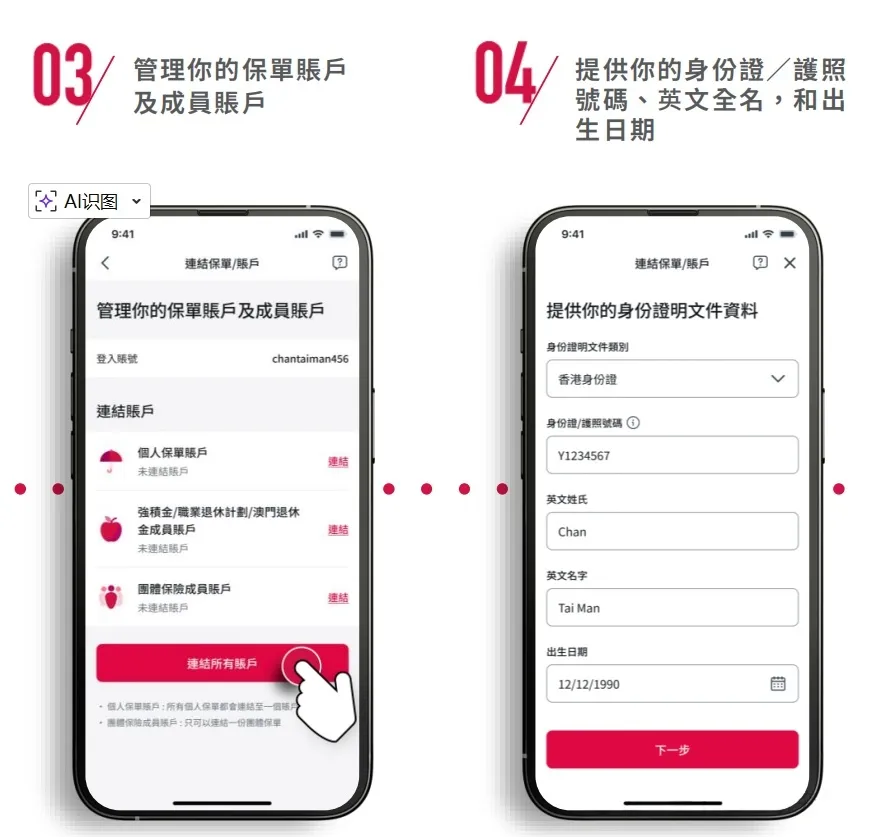 重点提醒:已投保的AIA客户,在注册过程中必须准确填写身份证或护照信息,才能成功关联个人保单,正常使用各项核心功能。