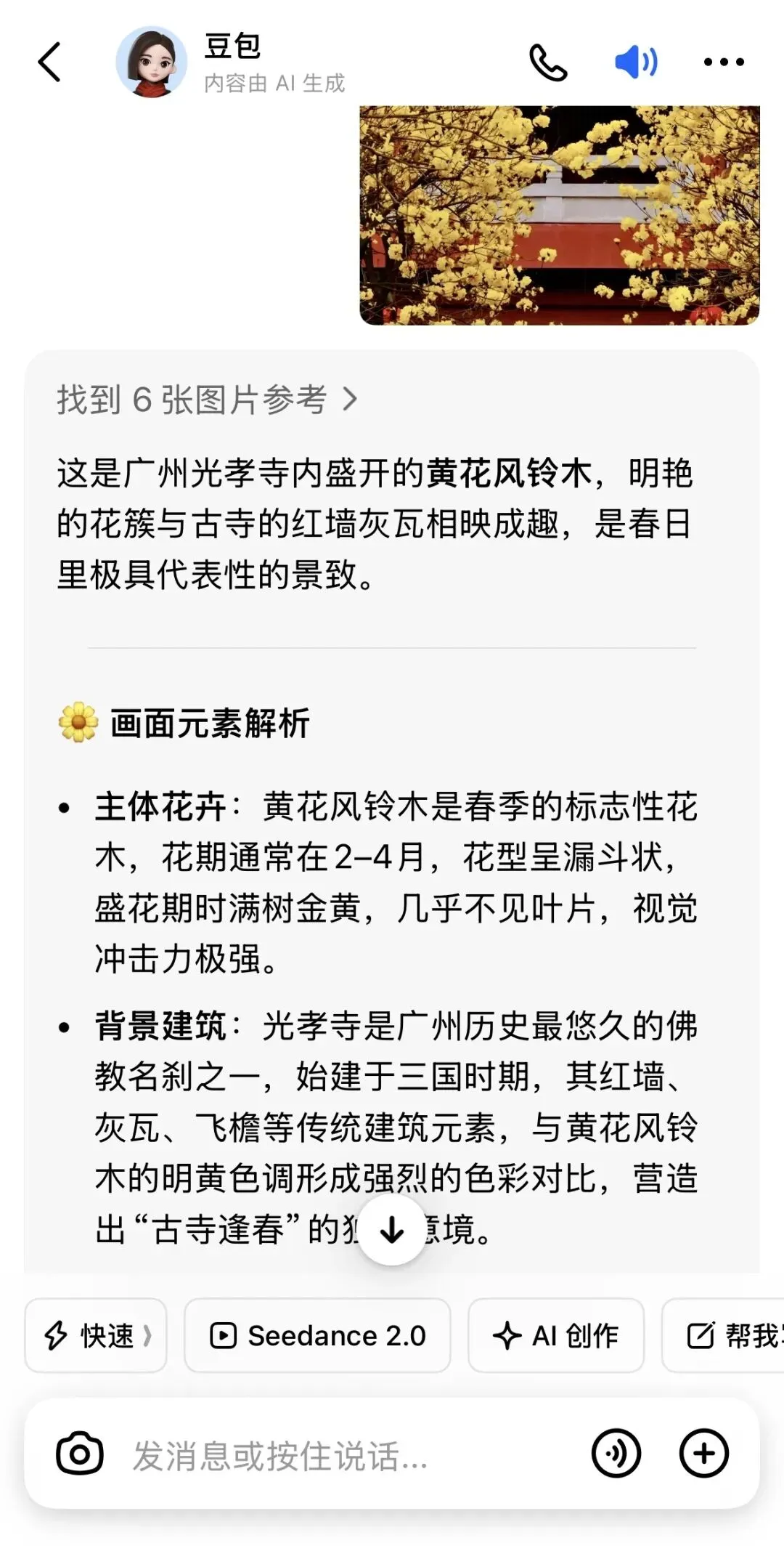 三个解读成功的app中,“某包”的解读有点不一样,那就是开篇就直接指出“这是广州光孝寺内盛开的黄花风铃木…”然后在讲述花木后,还讲解了光孝寺的历史,最后还给出拍摄好这片黄花风铃的小窍门指引… 而,这张照片,我的确是在广州光孝寺内拍摄的。