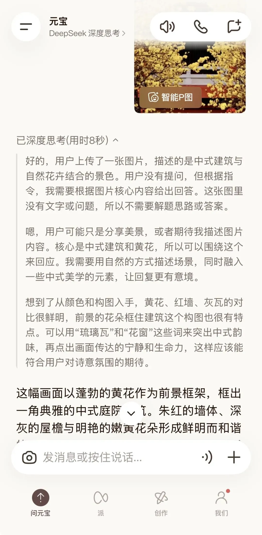 下面说结果,“某包”,“某宝”,“某问”都解读了图片的花木为“黄花风铃”,且都说出了与黄花风铃相关的花木常识,再有就是解读了图片中的黄花与中式亭台楼宇的黄和红色调相映成趣的风格… 唯独“D某S”却在上传图片后显示“未提取到文字”,没有继续解读了。