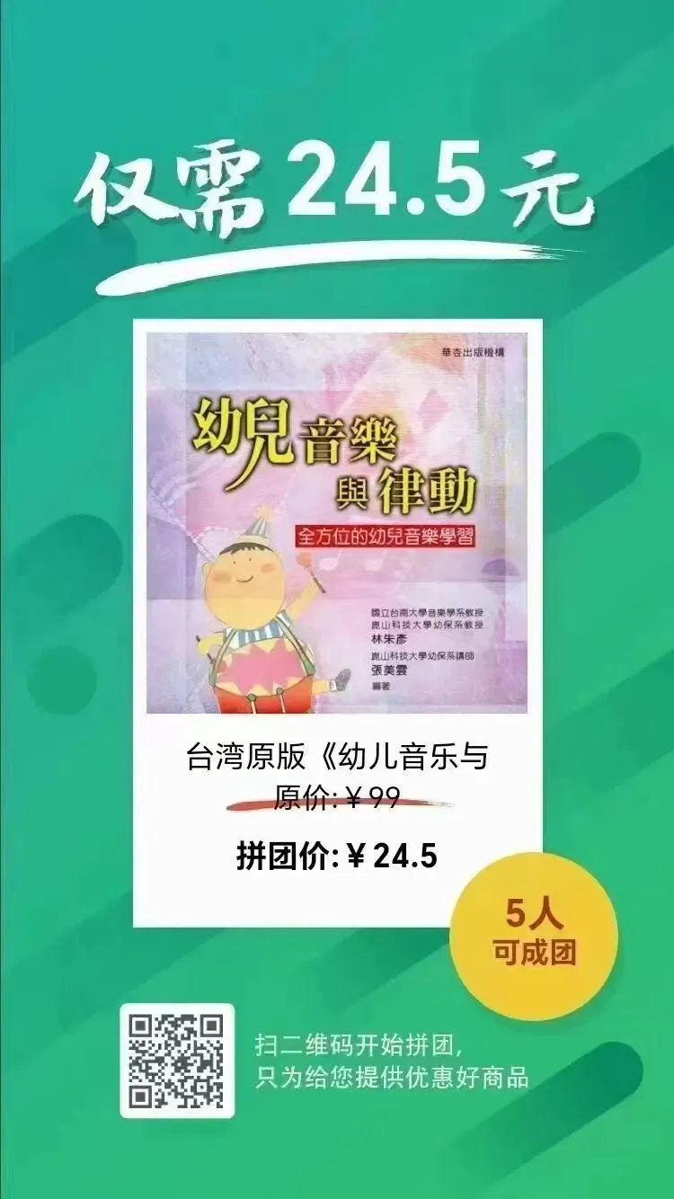 📚台湾原版《幼儿音乐与律动:全方位的幼儿音乐学习》,优惠拼团请点击阅读原文或扫码下图二维码(拼团马上发放,请添加客服微信:bwv618):