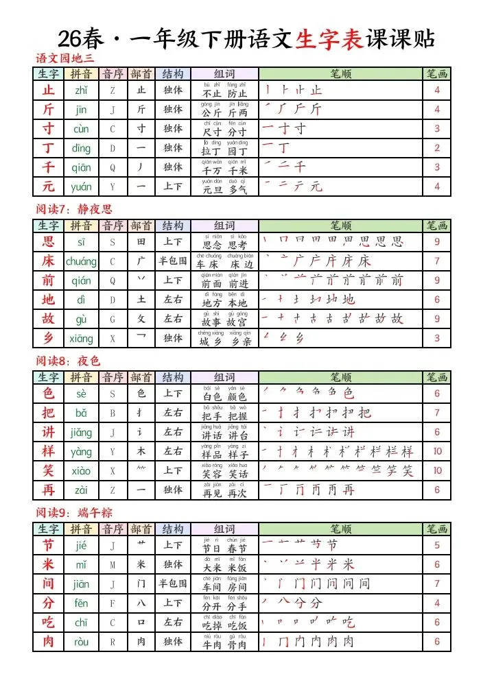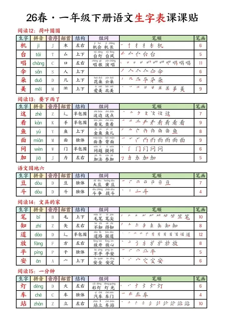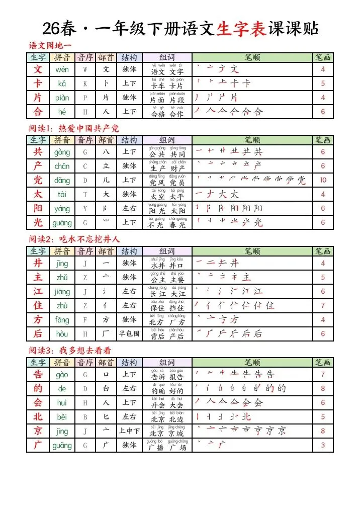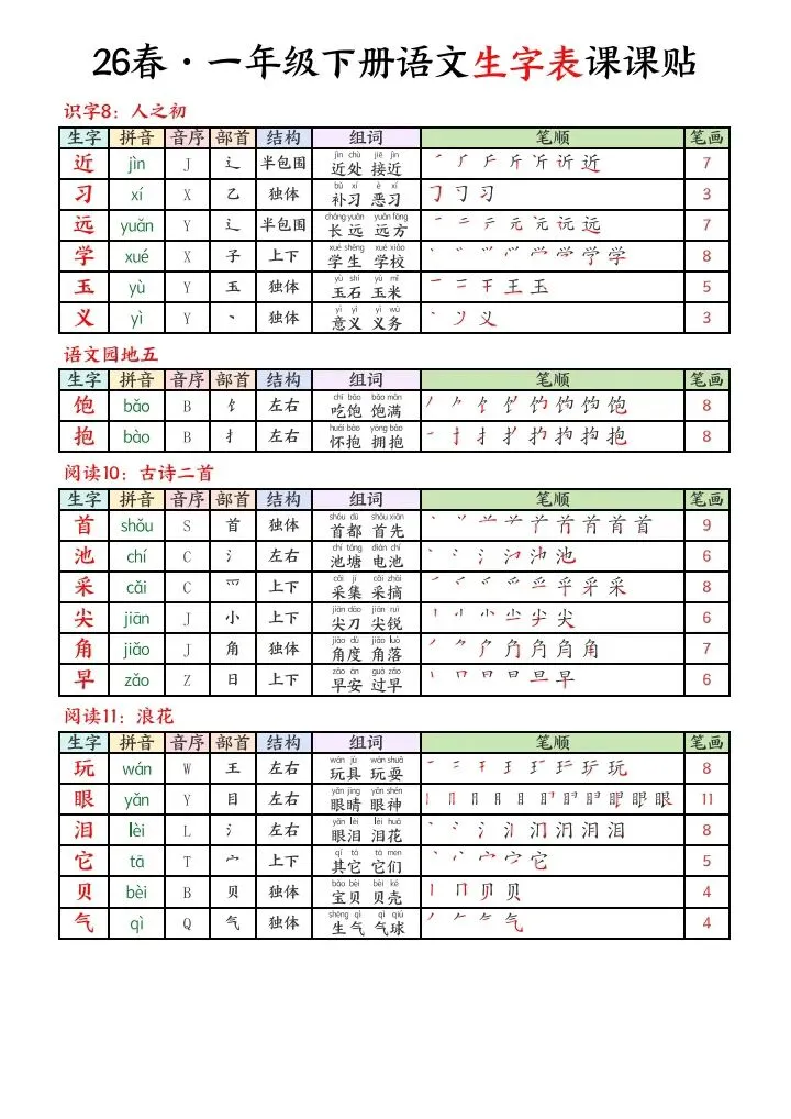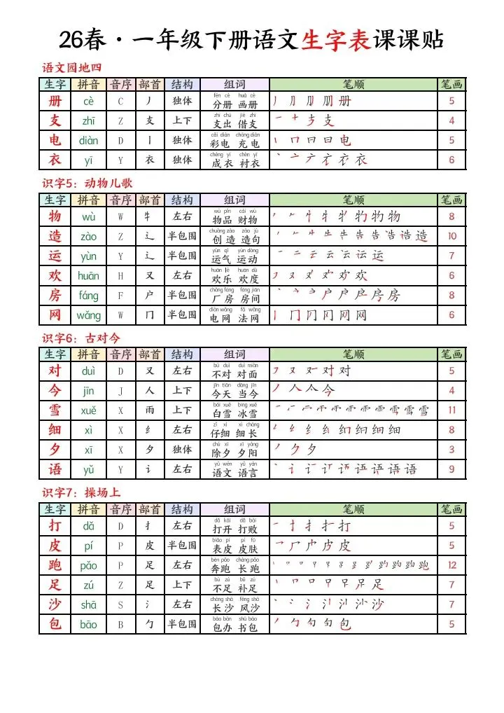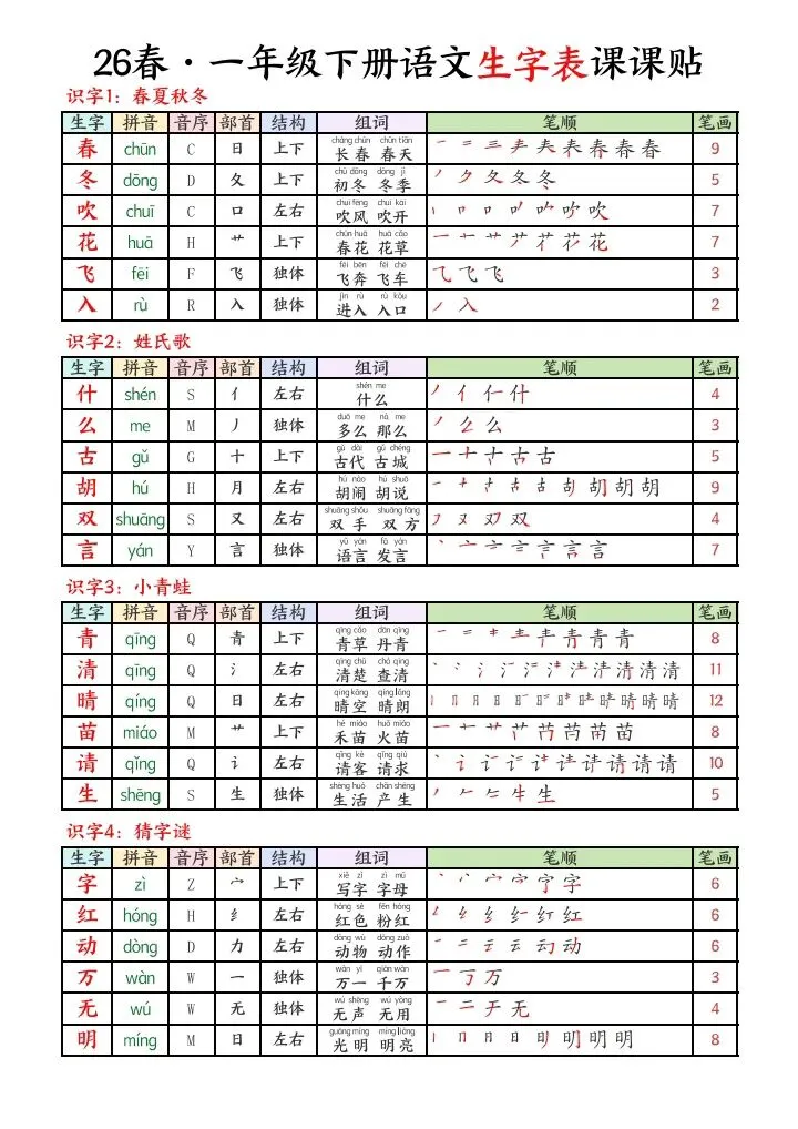 2026春一年级下册语文生字课课贴电子版可下载打印