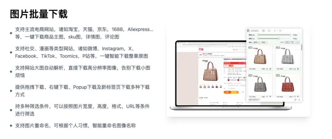 淘宝、京东、拼多多商品图一键打包下载,主图、SKU图、详情页图、买家秀……全部不在话下。