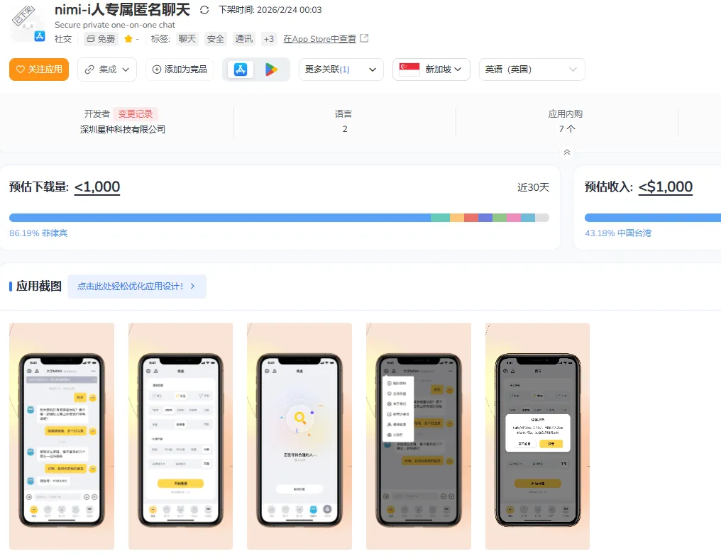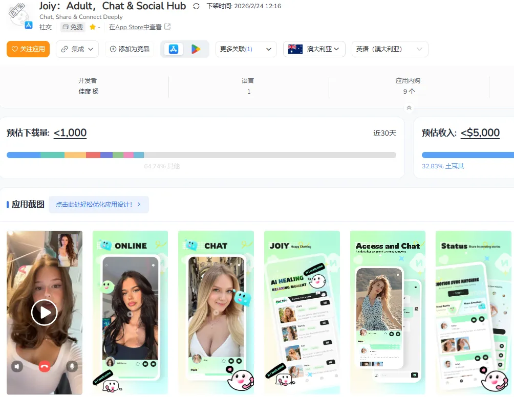 再看新加坡和澳大利亚,这两个市场的数据就像是一对“镜像双胞胎”:大量带有”匿名聊天””视频聊天”功能的应用被连根拔起。