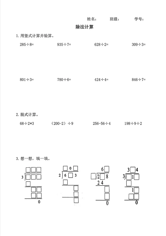 三(下)数学(通用版)除法竖式计算|电子版可打印
