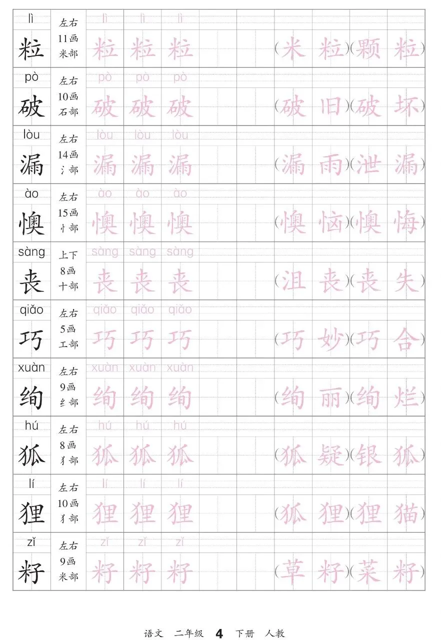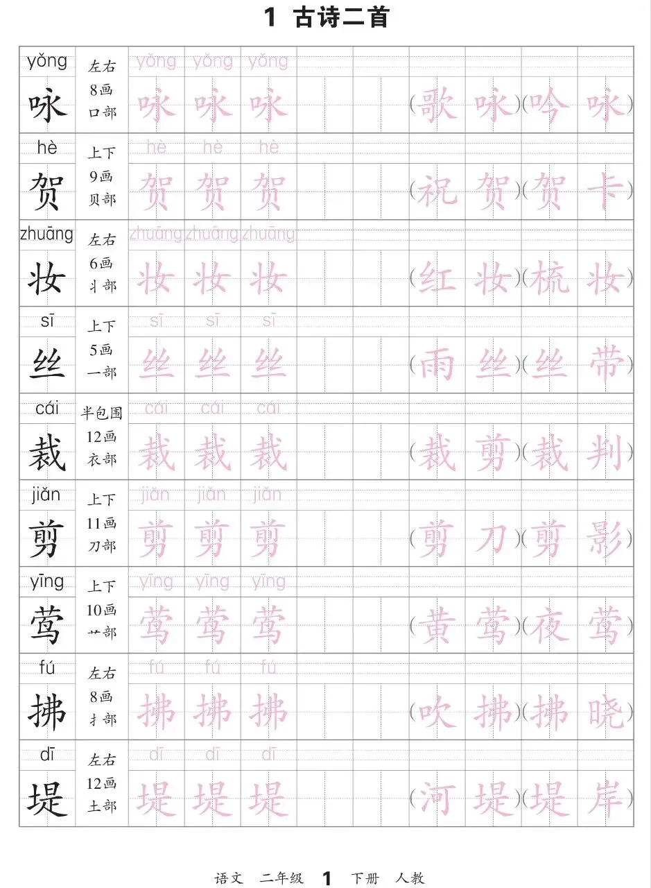 二下语文-会认字描帖电子版免费下载!