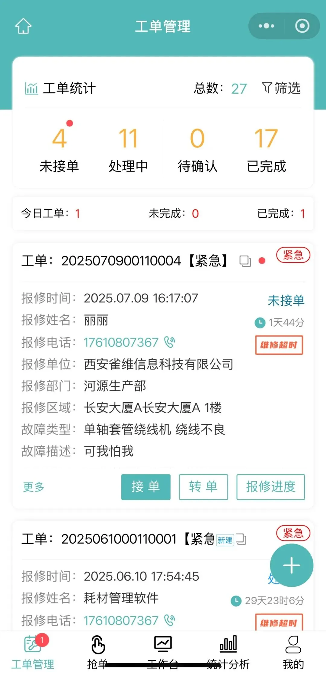 业主通过二维码扫码、微信公众号、小程序提交的报修请求,都能实时汇总至派单软件后台。