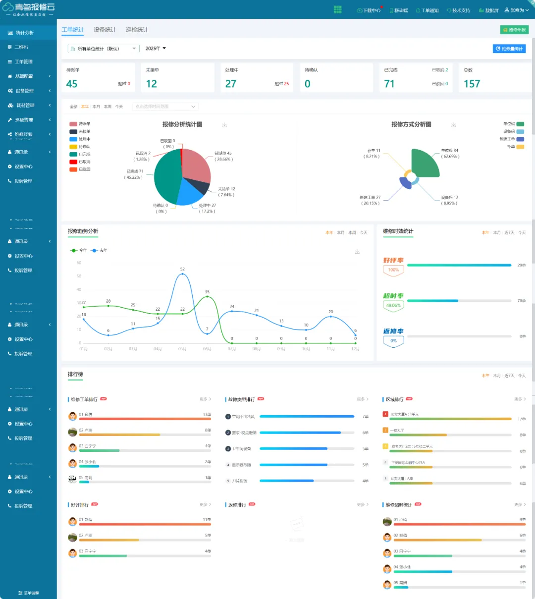 所有工单数据沉淀下来后,派单软件会自动生成多维度的报表:维修及时率、故障类型排行、人员绩效排行等。