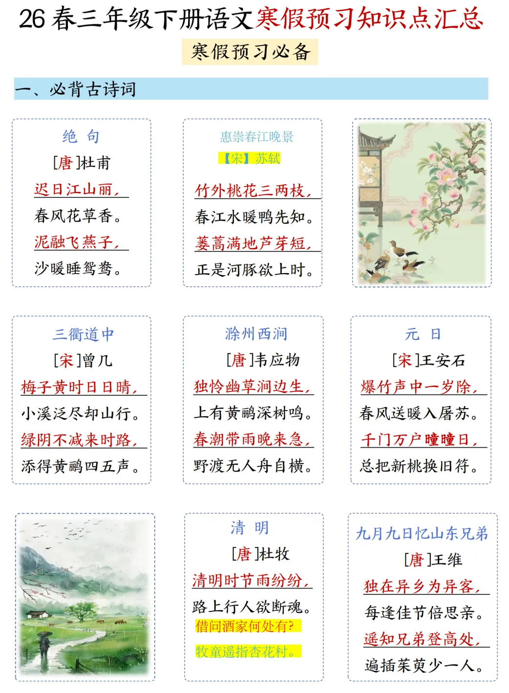 三年级(下册)语文知识汇总-可打印 大家好,我是你们的老朋友学易通。 2026年的寒假即将结束,三年级的小朋友们马上要迎来下学期的课程了。今天给大家分享一份三年级语文下册知识汇总,希望能帮助到三年级小朋友提前了解学习内容,一起看内容: 因为篇幅问题,今天的分享就到这里了,有想要完整资料的朋友可以菜单资料库自取或者点击下方卡片。关注我,每天带给你不一样的学习资料~ (ps:在小程序中通过签到和分享可以获得积分哦!)