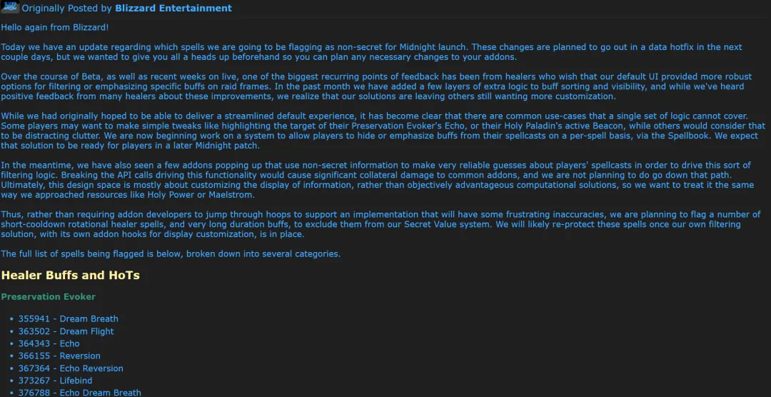 当然,这并不是长期放权。蓝帖里已经提到,未来会推出一个“法术书自定义增益过滤系统”,允许玩家按法术决定哪些增益高亮、哪些隐藏。等这套系统成熟,相关技能很可能会重新纳入保护范围。方向依然很清晰,默认 UI 要足够强大,插件更多承担外观与个性化的角色。但在那之前,治疗终于可以安心看清自己铺了什么。
