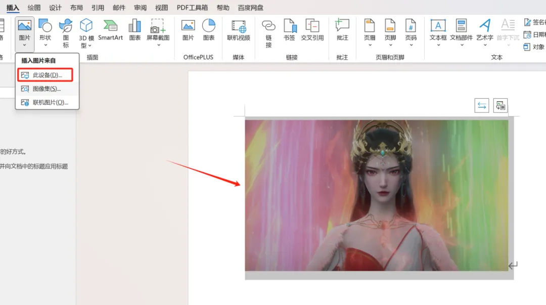 选择图片来源:在“插入”工具栏中找到“图片”按钮,点击后弹出菜单,若要插入本地图片,选择“此设备”;若要插入在线图片,选择“在线图片”。