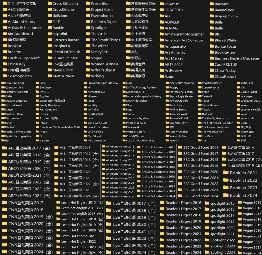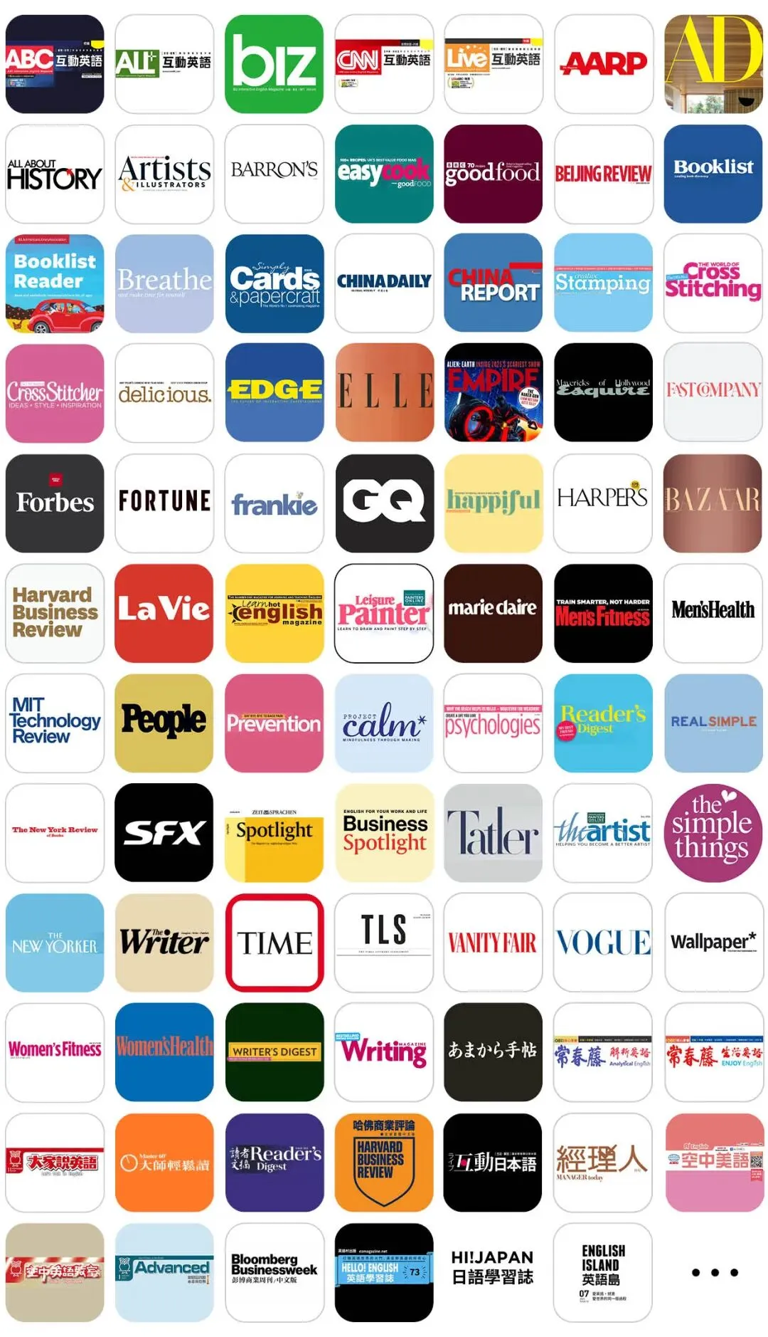 ABC互动英语、ALL+互动英语、Biz互动英语、CNN互动英语、Live互动英语、AARP、Architectural Digest、All about History、Artists & Illustrators、Barron’s、BBC Easy Cook、BBC Good Food、BeijingReview、Booklist、Booklist Reader、Breathe、Cards & Papercraft、China Daily、China Report、Creative Stamping、Cross Stitching、CrossStitcher、delicious、Edge、ELLE、EMPIRE、Esquire、Fast Company、Forbes、Fortune、frankie、GQ、Happiful、Harper’s、Harper’s Bazaar、Harvard Business Review、La Vie、Learn Hot English、Leisure Painter、Marie Claire、Men’s Fitness、Men’s Health、MIT Technology Review、People、Poetry、Prevention、Project Calm、Psychologies、Reader’s Digest、Real Simple、Review of Books、SFX、Spotlight、Business Spotlight、Tatler、The Artist、The Simple Things、The New Yorker、The Writer、Time、TLS、Vanity Fair、Vogue、Wallpaper、Women’s Fitness、Women’s Health、Writer’s Digest、Writing、あまから手帖、常春藤解析英语、常春藤生活英语、大家说英语、大师轻松读、读者文摘、哈佛商业评论、互动日本语、经理人、空中美语、空中英语教室、彭蒙患英语、彭博商业周刊、学习志、英语岛等……