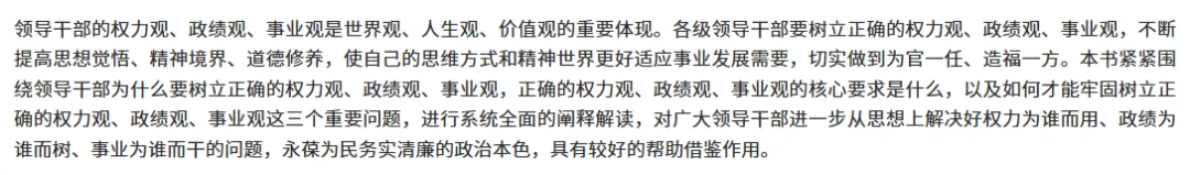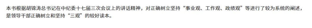 《领导干部事业观工作观政绩观教育读本》编写组. 领导干部事业观工作观政绩观教育读本[M]. 北京: 人民日报出版社, 2009. ISBN:978-7-80208-782-8