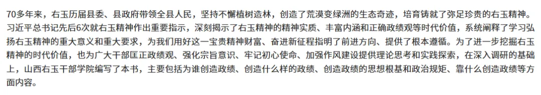 山西右玉干部学院. 右玉精神的当代价值: 树立和践行正确政绩观的理论和实践[M]. 北京: 党建读物出版社, 2024. ISBN:978-7-5099-1586-8