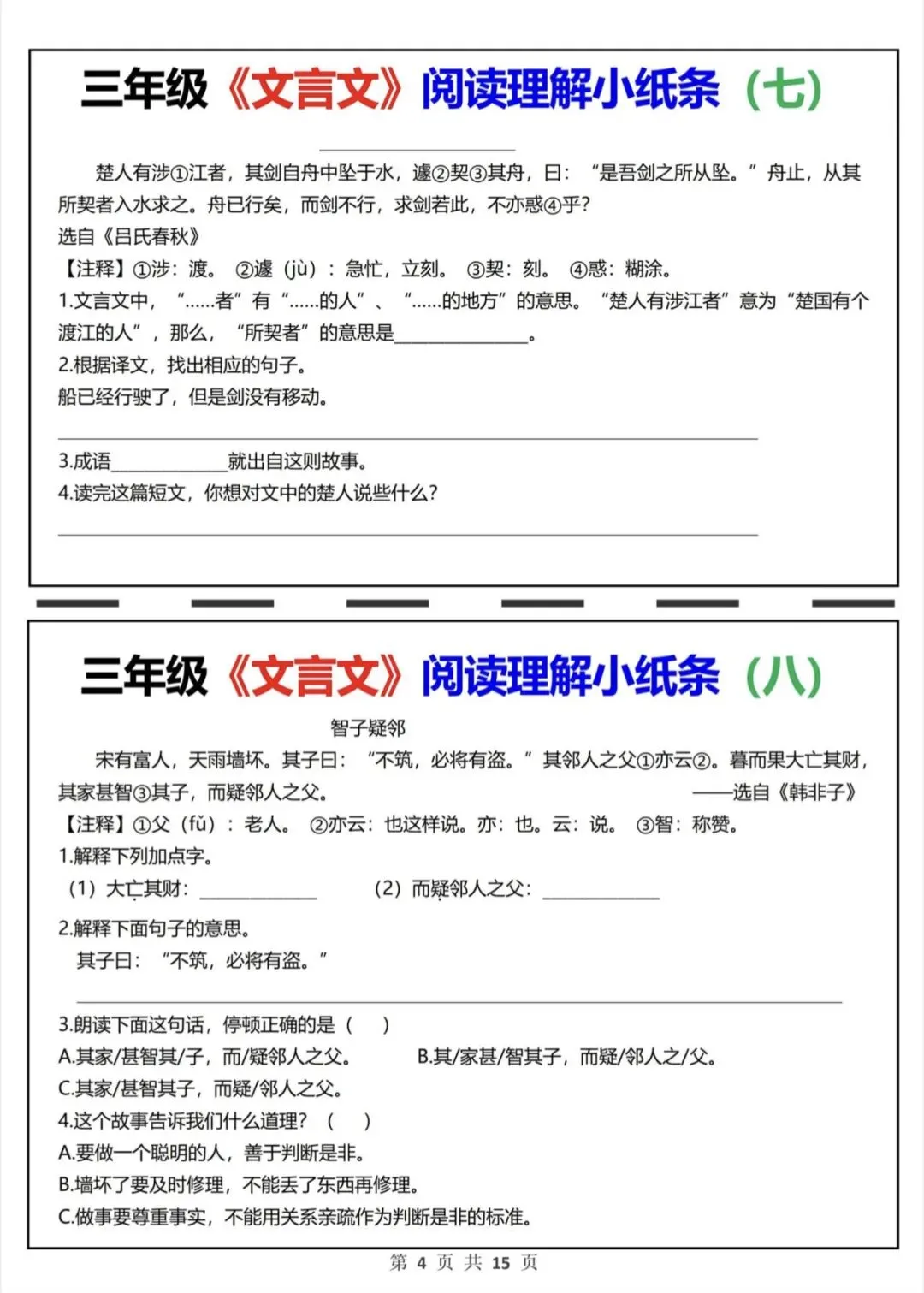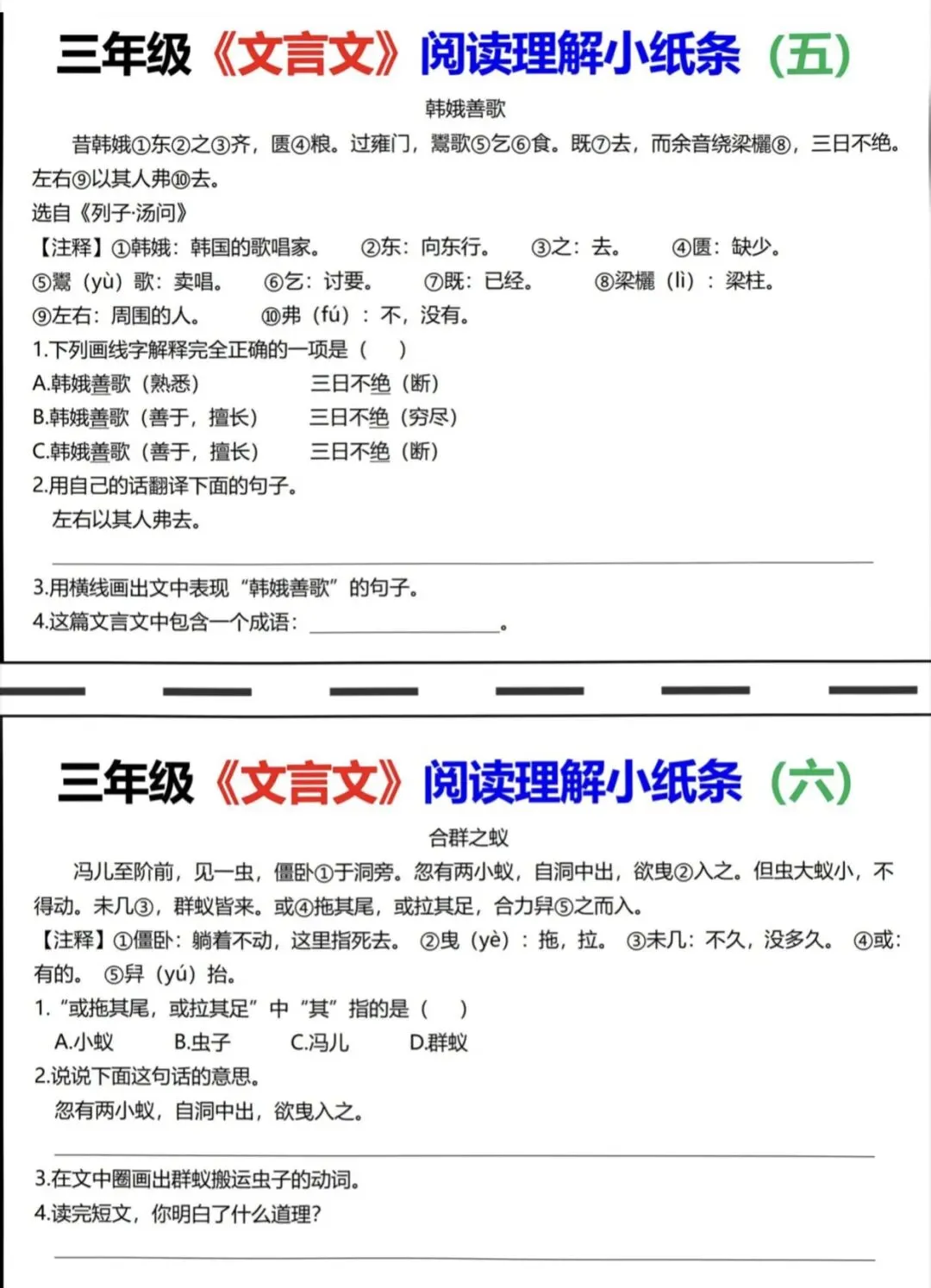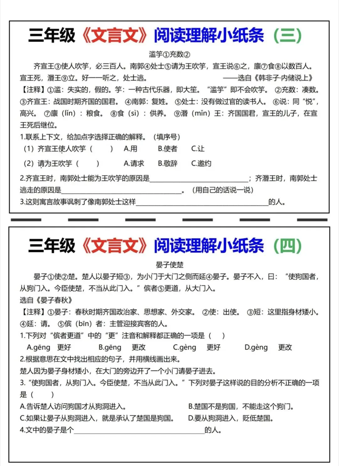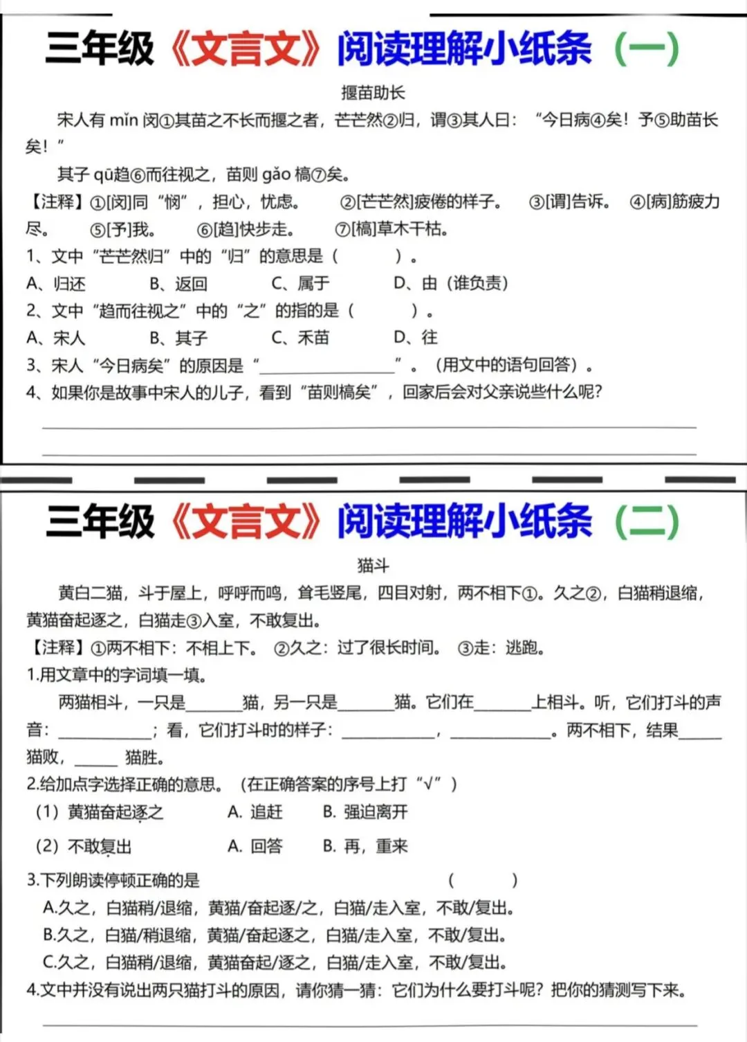 三年级语文文言文阅读理解小纸条|可打印