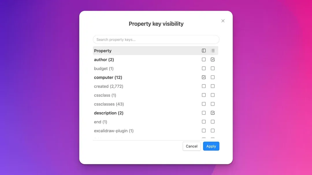 首先,新增了属性键选择弹窗,支持搜索、全选/取消全选,并可自主选择每个属性是显示在导航面板、列表面板,还是两者都显示。你可以通过右键点击 ” 属性 ” 并选择 ” 配置属性键 ” 来开启。