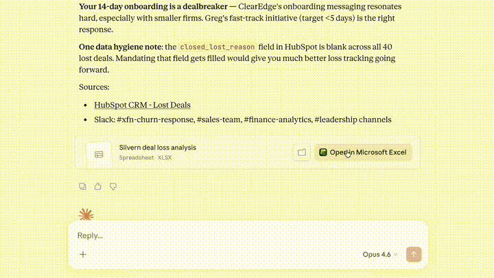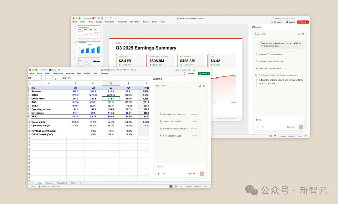 告诉Claude:「先分析这份财报,更新财务模型,然后做一页总结幻灯片。」它便会自动在Excel里跑完数据分析,提取上下文,无缝传递到PowerPoint生成演示文稿。