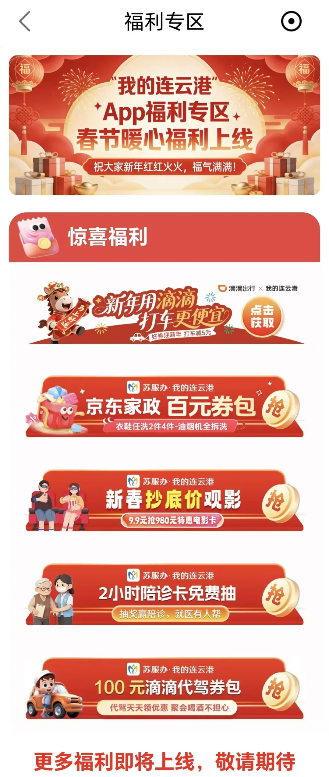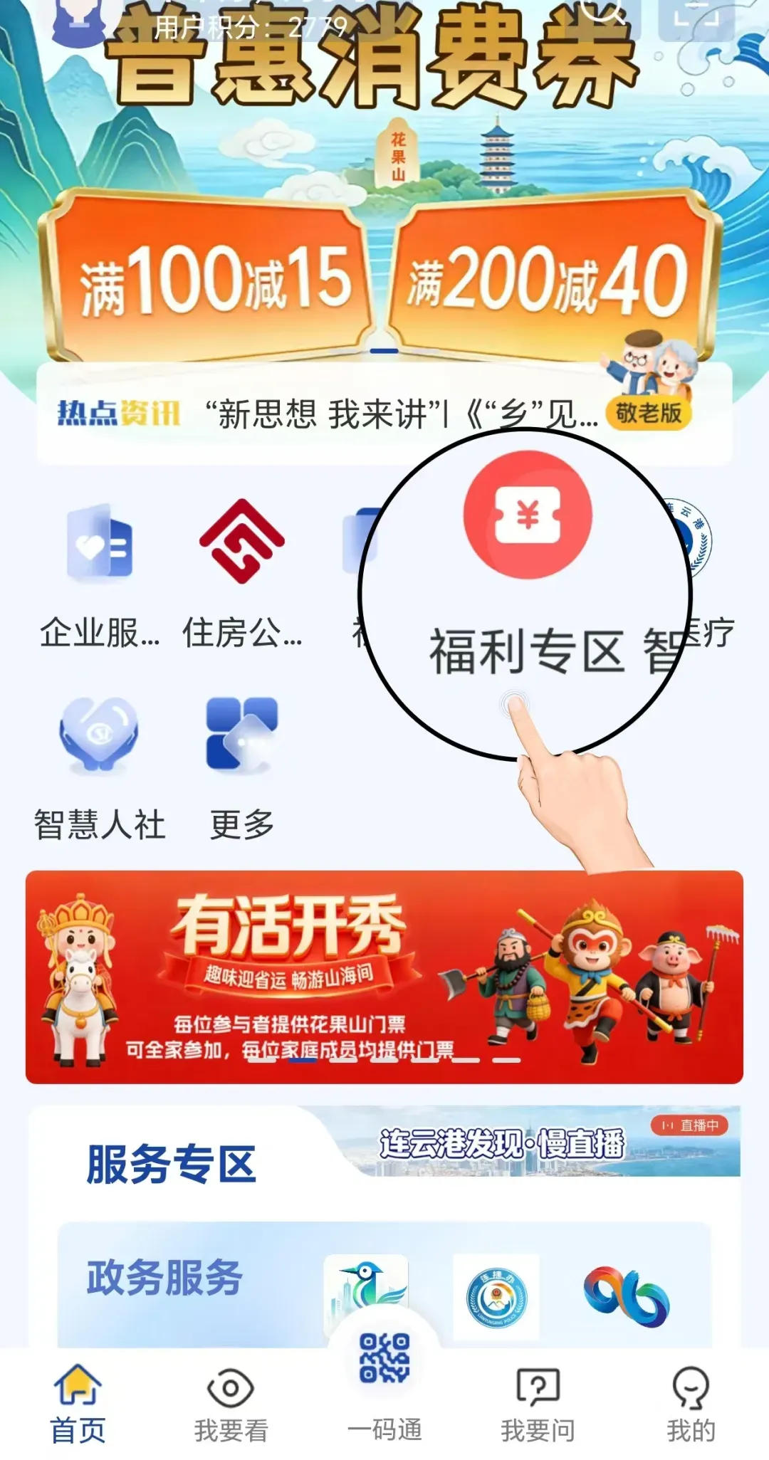 第一步:登录“我的连云港”APP,在首页点击进入【福利专区】。