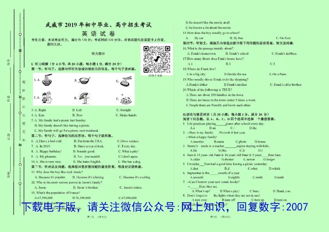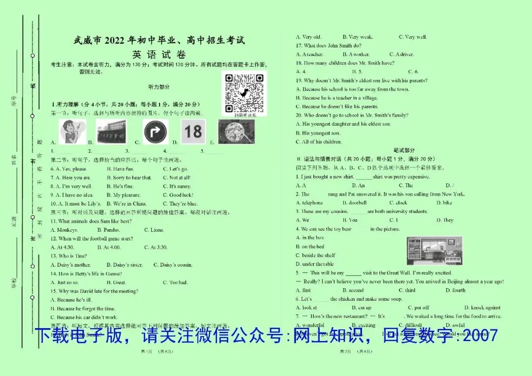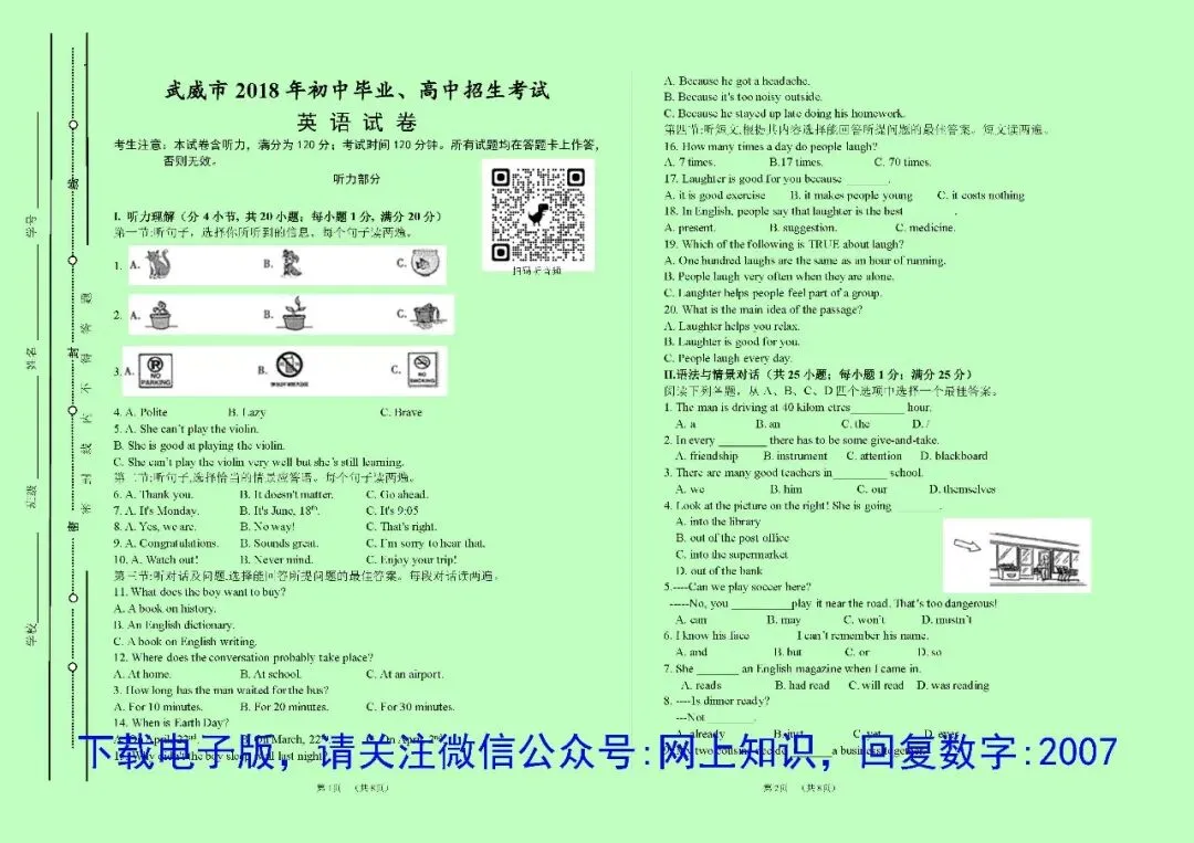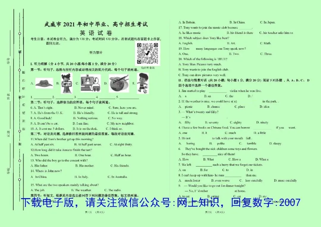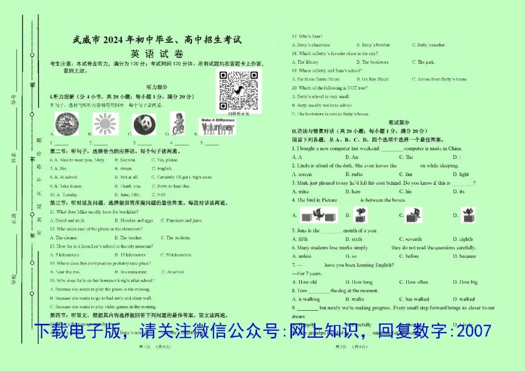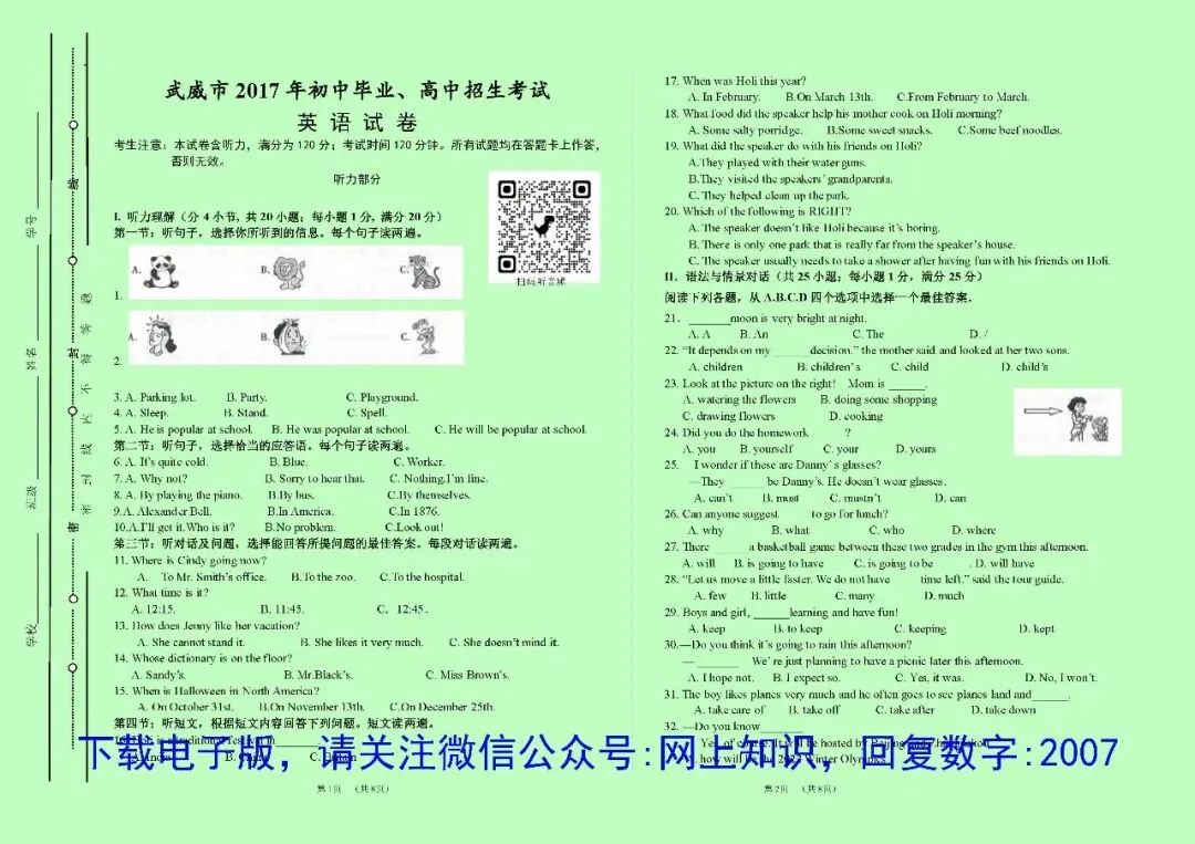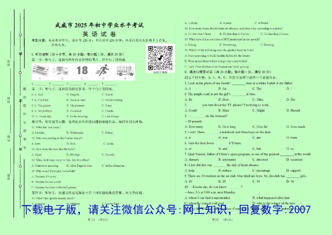 区别是:PDF格式文件不可修改编辑,要使用电脑连接有线打印机打印,不能使用网上无线打印;Word格式文件可以任意编辑、修改、排版;不需要重新编辑的情况,用PDF格式的就可以了,政、史、地、生4科目为A4纸版面,语、数、英、理、化5科目版面大小均为A3纸张,如需印到A4纸,可以在打印设置里面选择缩印到A4,但是内容文字会变小一半,如有特殊需要,可选择Word格式文件自己排版。2017-2025的试卷上均可扫码听听力音频