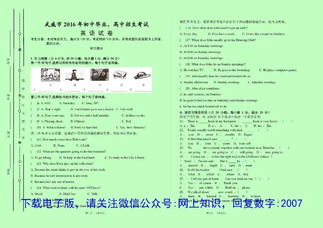 网上知识为大家整理了甘肃省武威市近5年中考英语中考真题及答案,也就是有些人说的省卷,对复习和研究中考命题有很大的帮助,你可以选择由印刷工厂打印后快递邮寄纸质版,或者用电子版自己打印,两种方式说明如下: