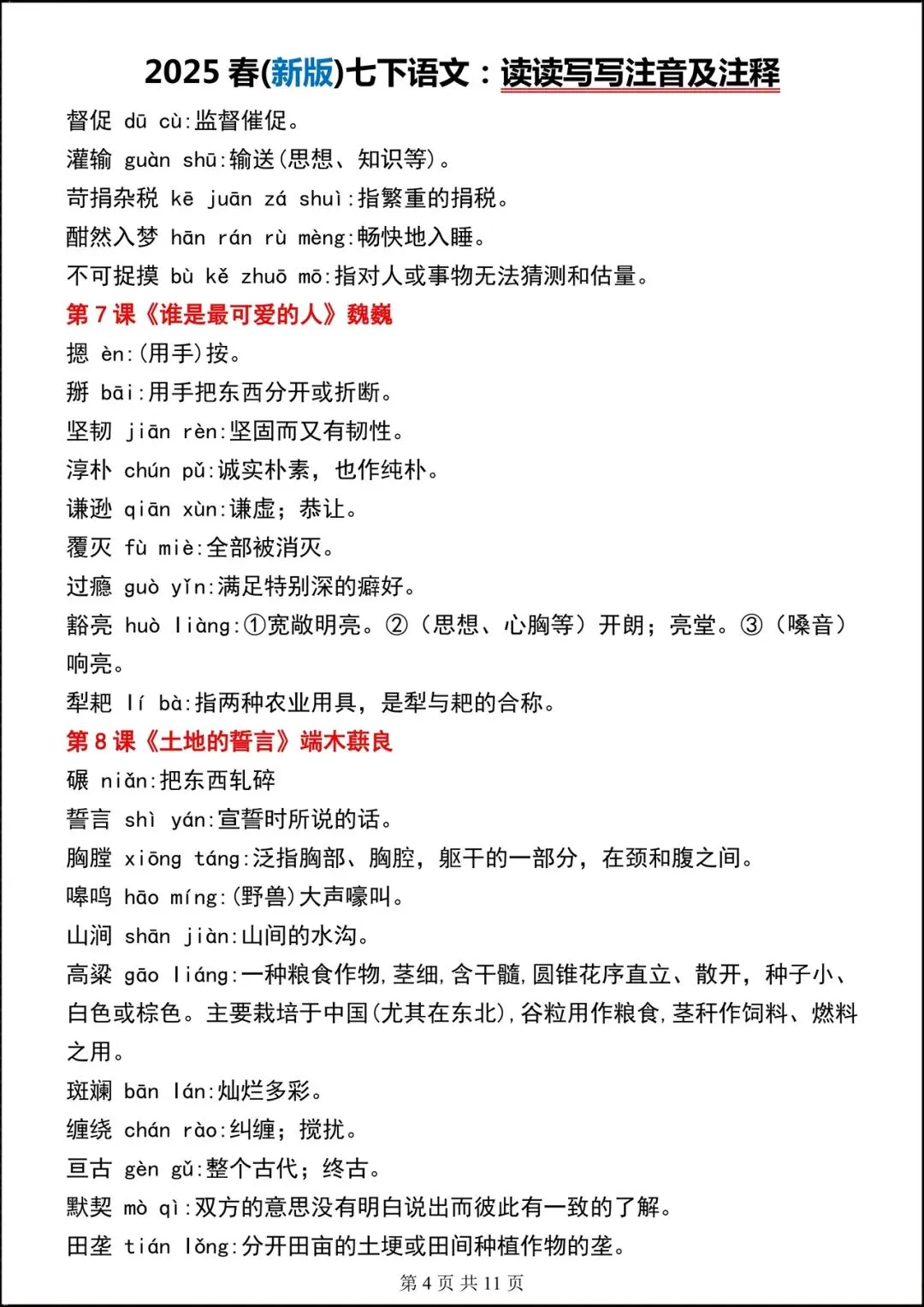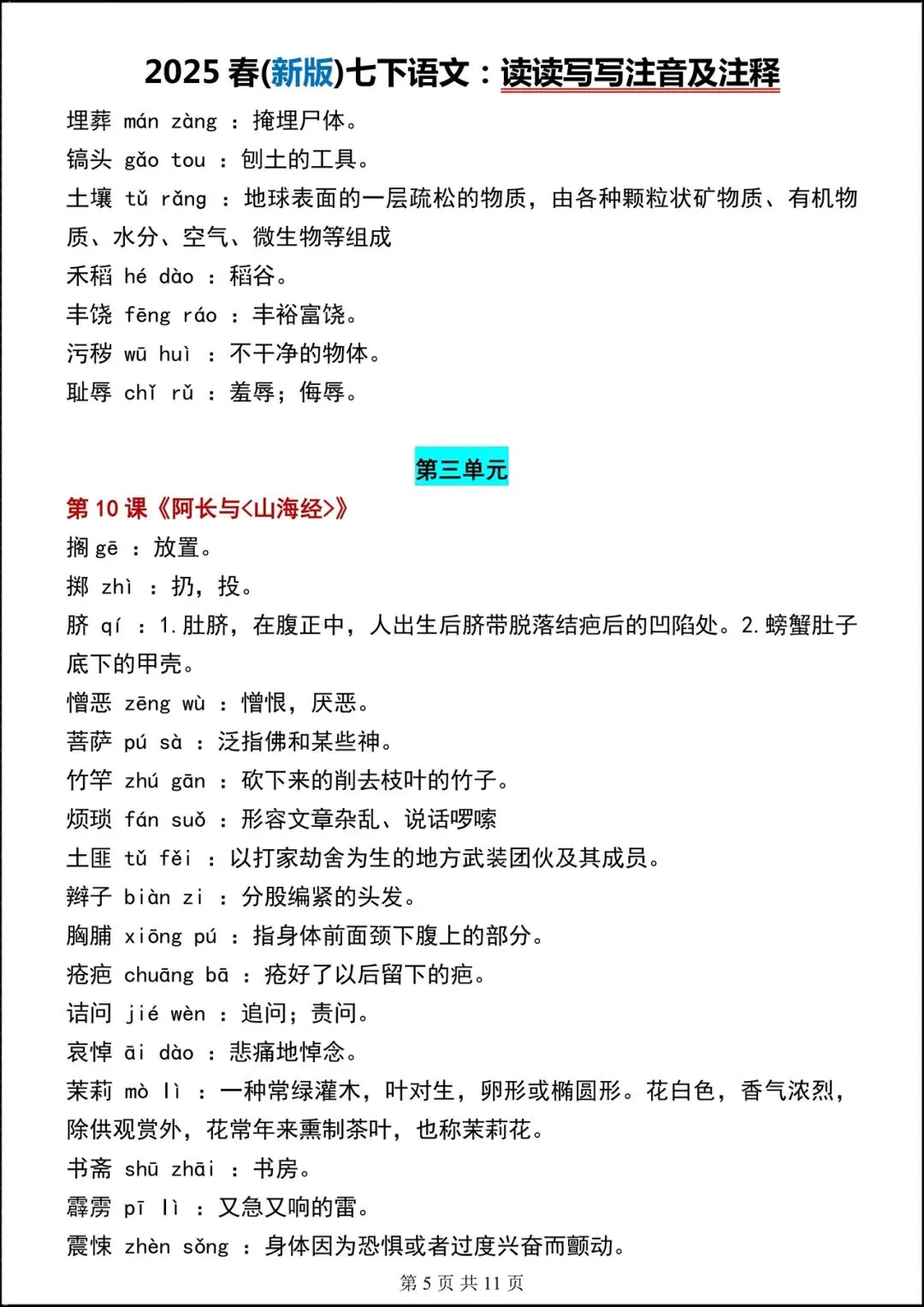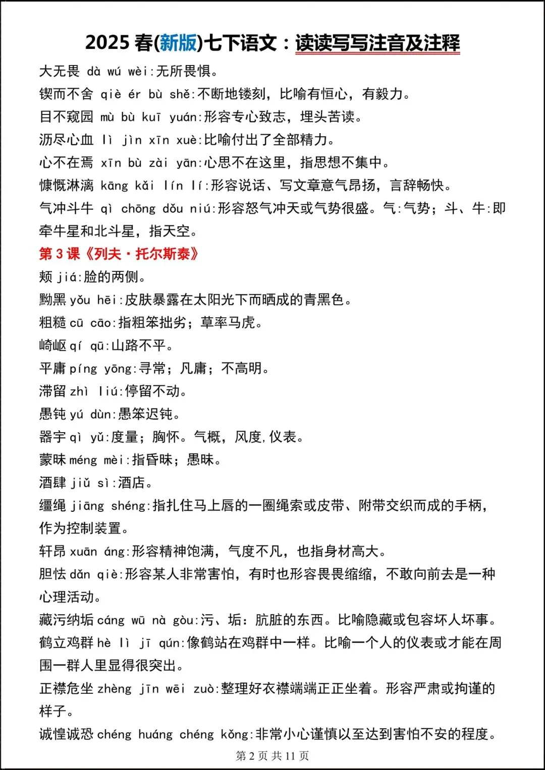 【开学预习】2026春新人教部编版七年级下册语文读读写写(注音+解释),可下载打印!