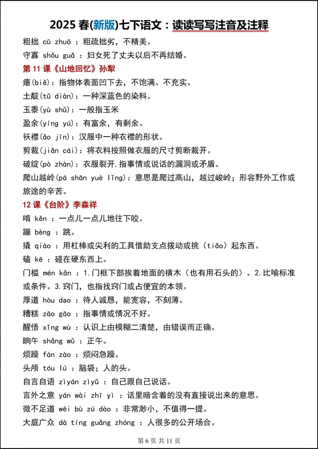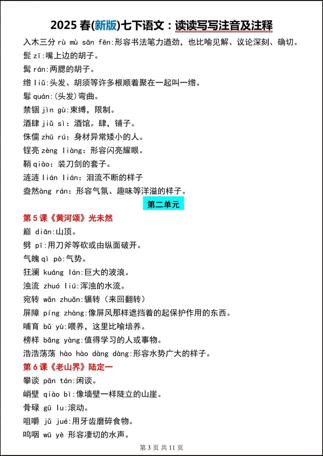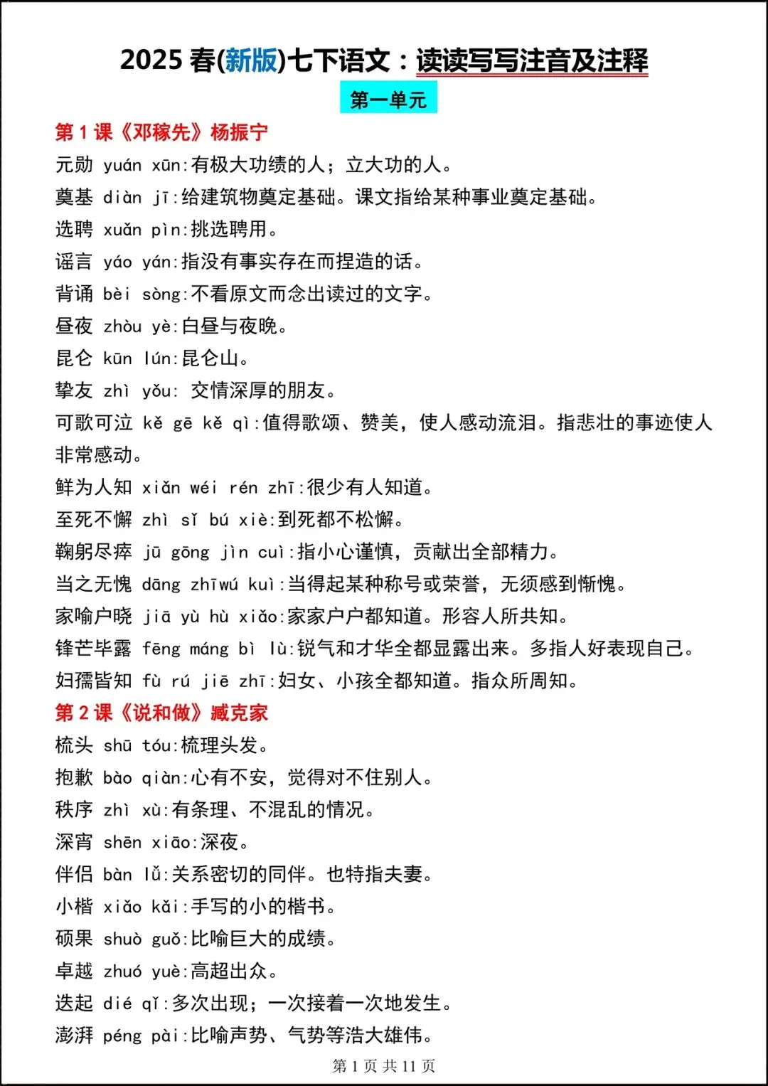 【开学预习】2026春新人教部编版七年级下册语文读读写写(注音+解释),可下载打印!