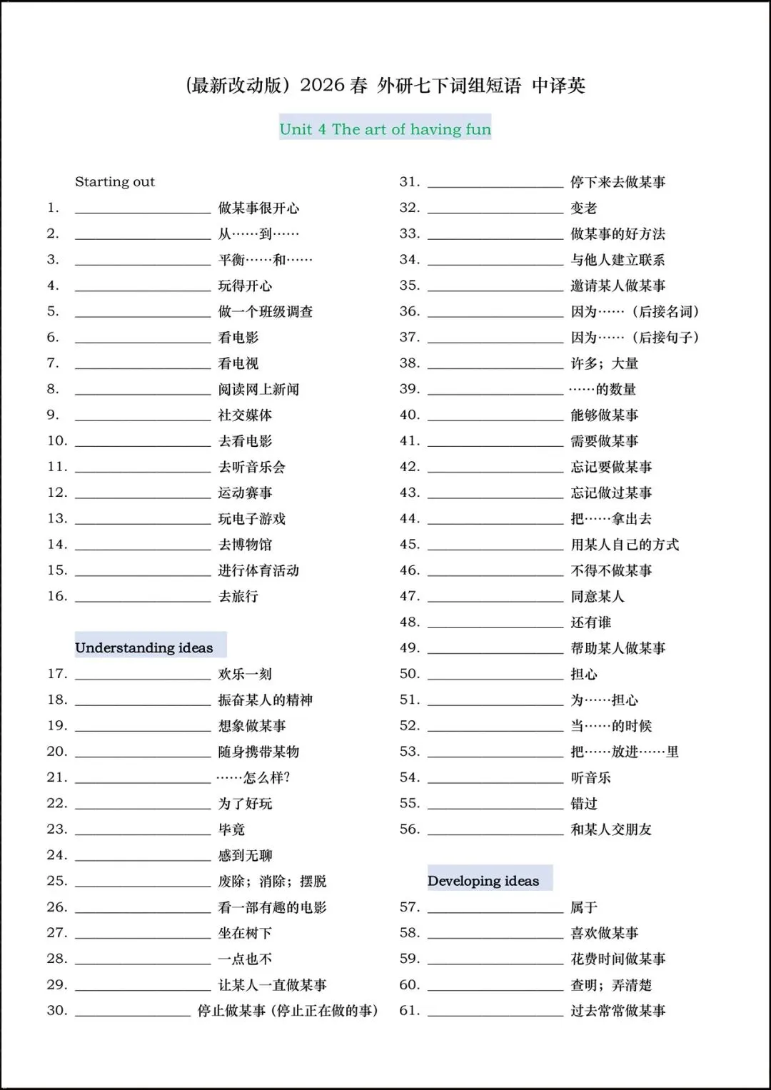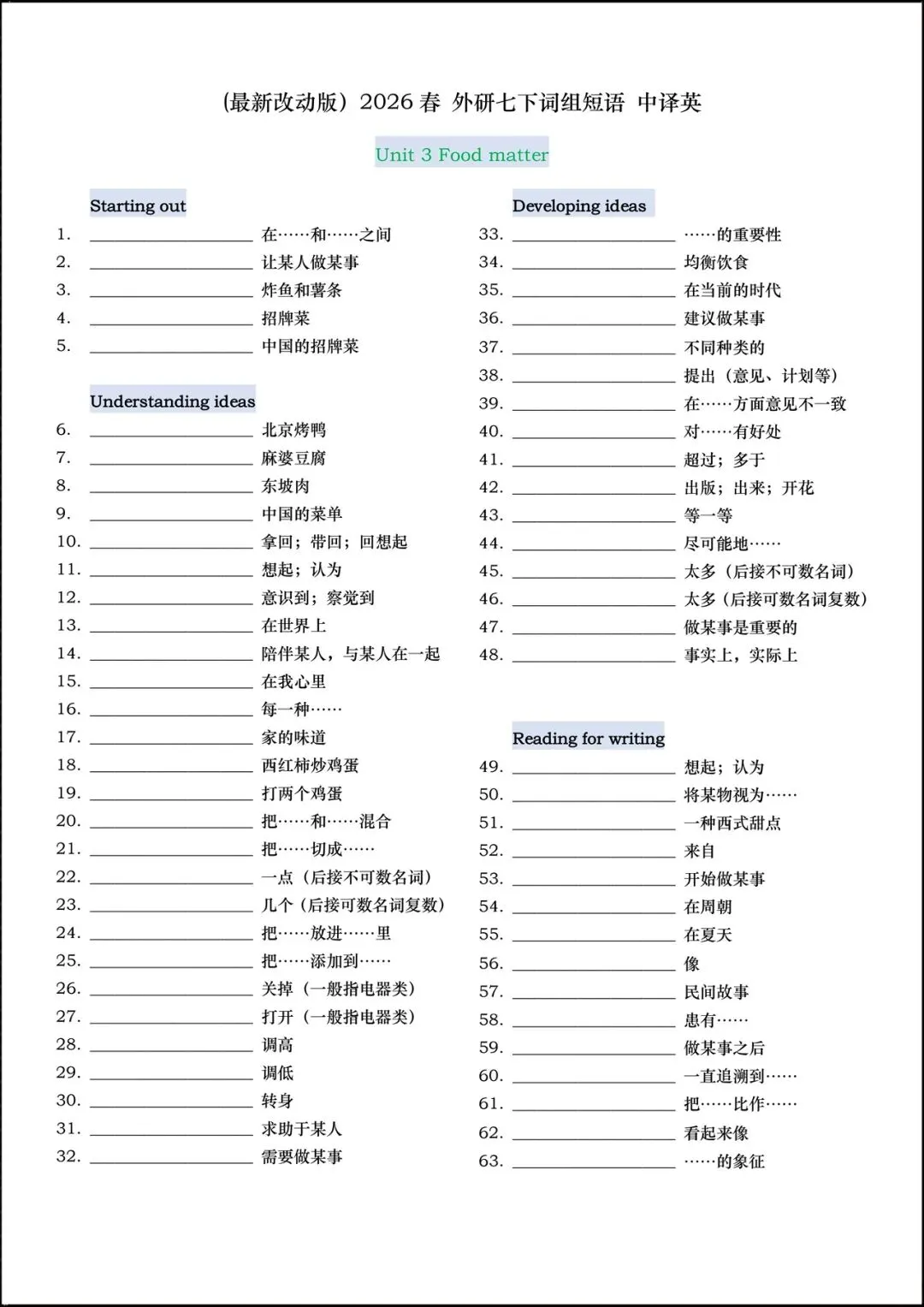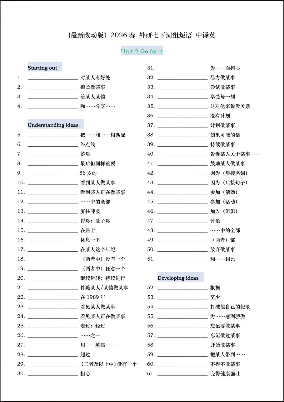 【开学预习】2026春(外研版)七年级下册《英语》词组短语汇总(中英互译+背诵版)完整可打印!