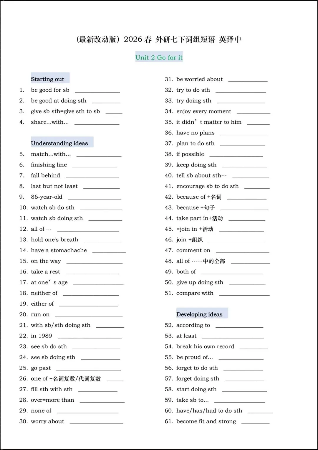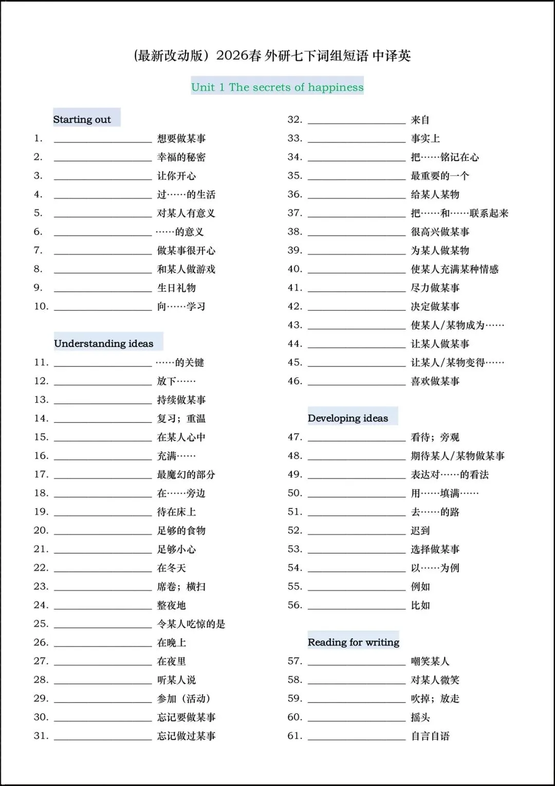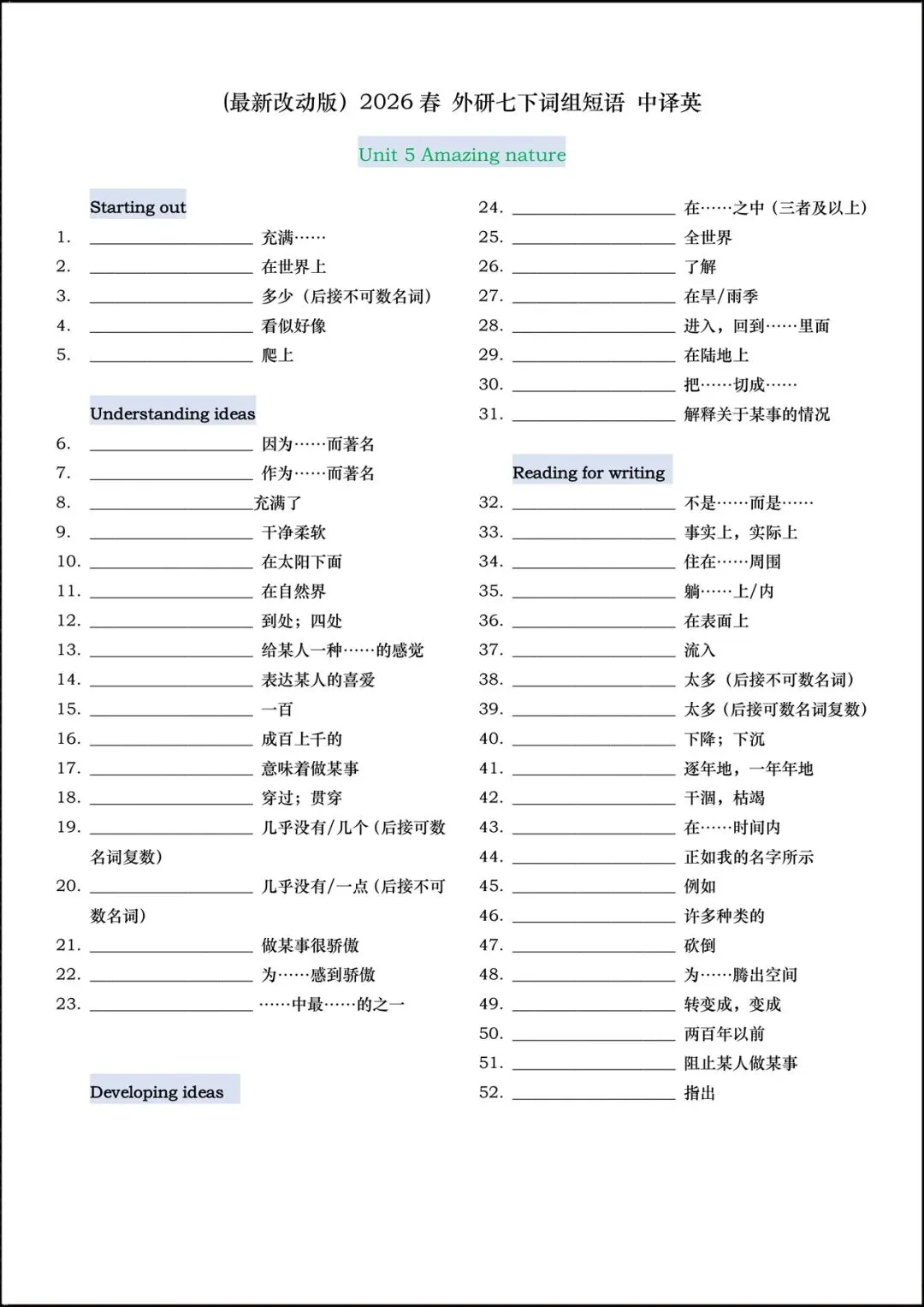 【开学预习】2026春(外研版)七年级下册《英语》词组短语汇总(中英互译+背诵版)完整可打印!