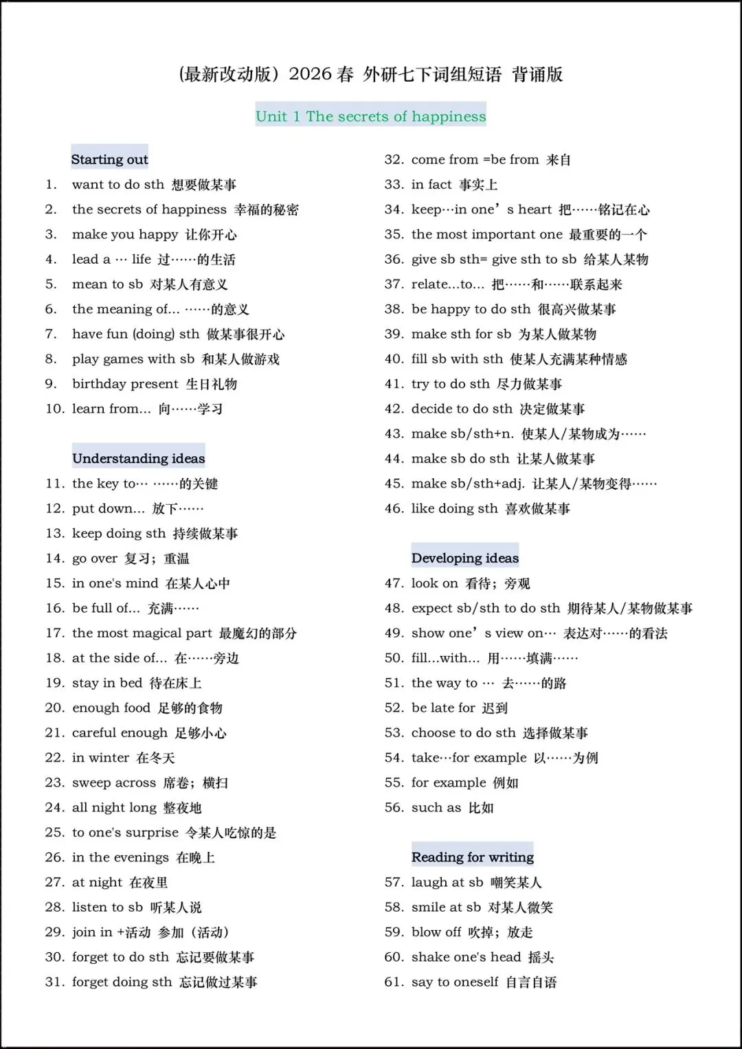 今日老师精心给大家整理: 【开学预习】2026春(外研版)七年级下册《英语》词组短语汇总(中英互译+背诵版)完整电子版可打印! |