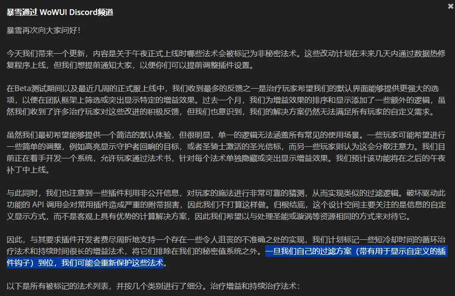 眼看“至暗之夜”要上线了,时间明显来不及了。于是暴雪想出了一个好办法——暂时开放治疗技能白名单,让插件开发者可以继续制作相关插件;等到官方完善了自定义功能后,再重新隐藏这些技能。