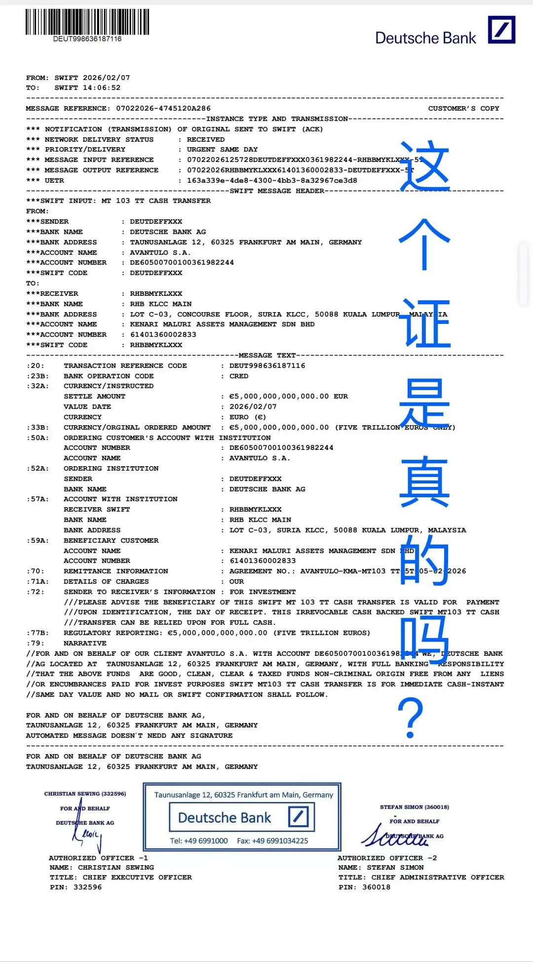 金额逻辑违背常理。该文件标注金额为5万亿(5,000,000,000,000.00)欧元。这是一个什么概念?德国2023年全年的GDP总额约为4.1万亿欧元。单笔MT103报文(客户汇款)不可能承载超过一个国家年度GDP的资金,这在现实金融运作中是不存在的。你可以直接拉黑了PDF提供方了