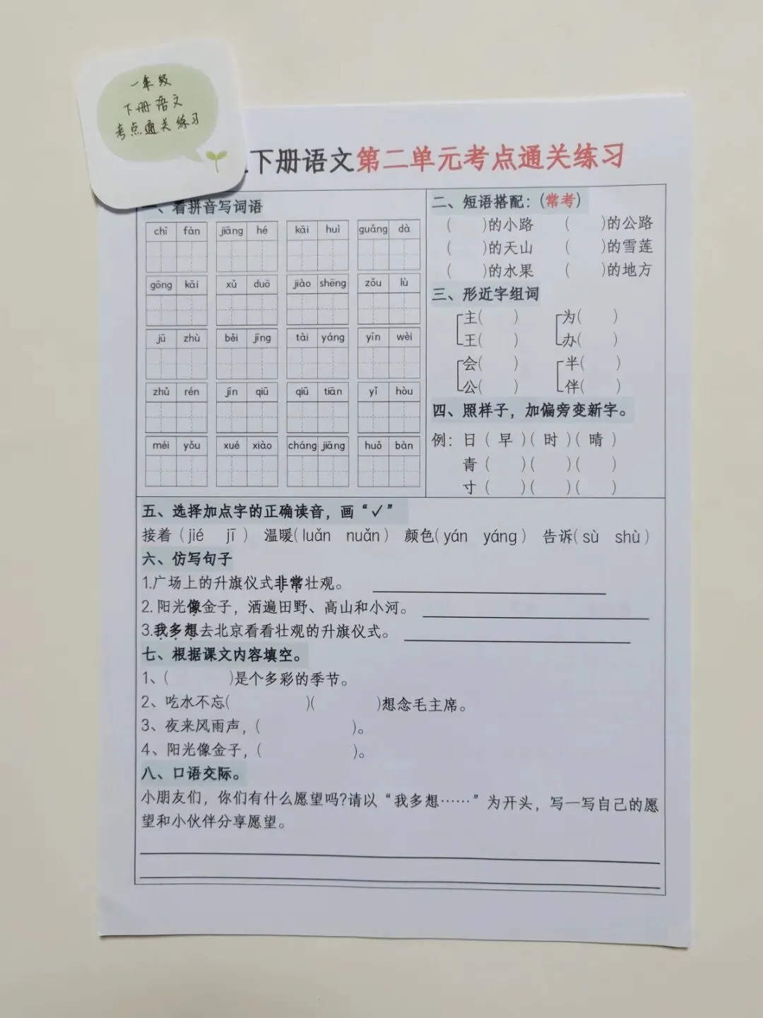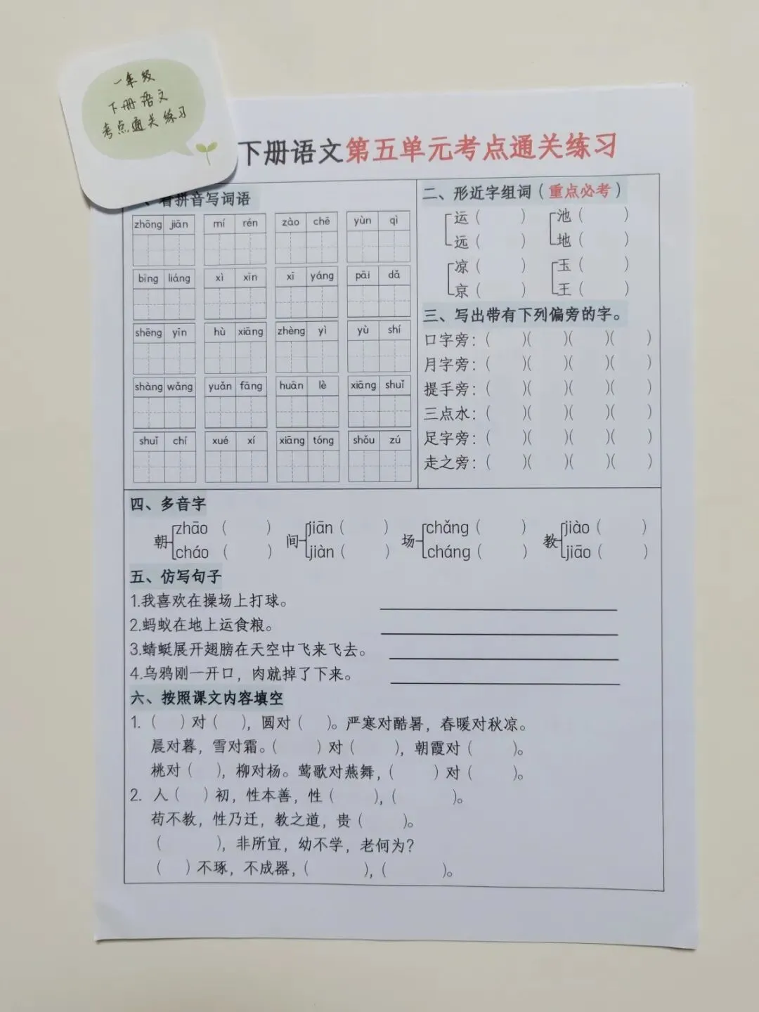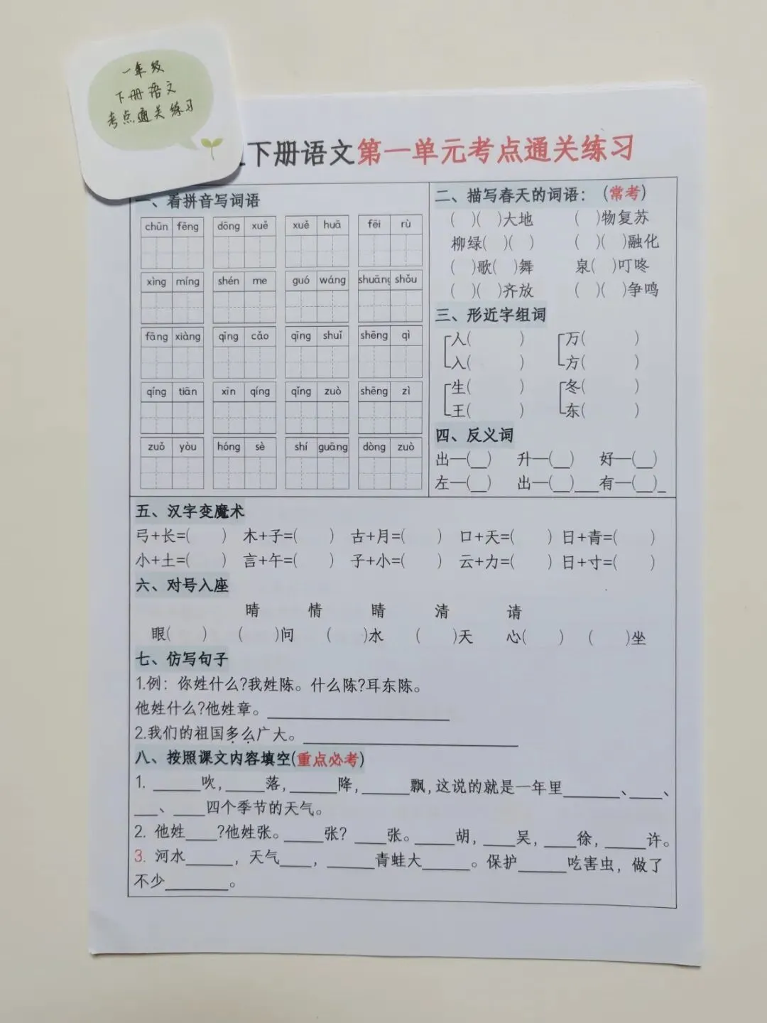 一年级下册语文 单元默写通关 🉑打印